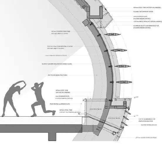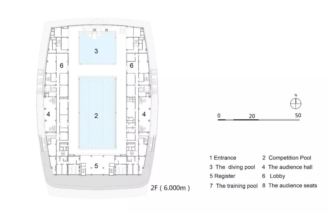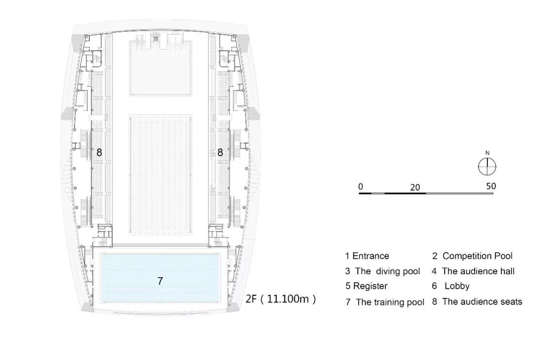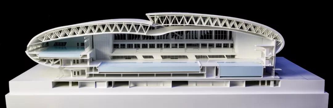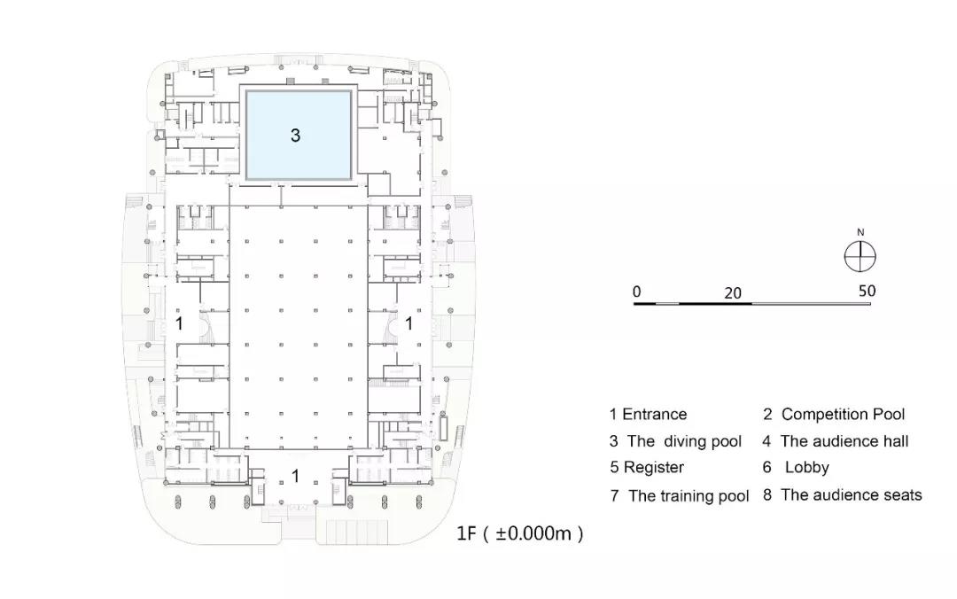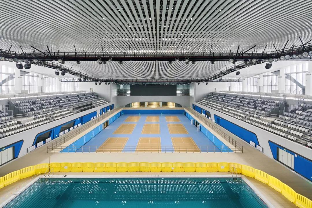 設計將游泳池和跳水池平層布置,而將訓練池架空10米,并錯層布置于比賽池斜上方。在滿足功能、流線的前提下,保證了三泳池均擁有良好的自然通風、采光條件,完成了一次巨大建筑體量與狹小用地間的極限挑戰。