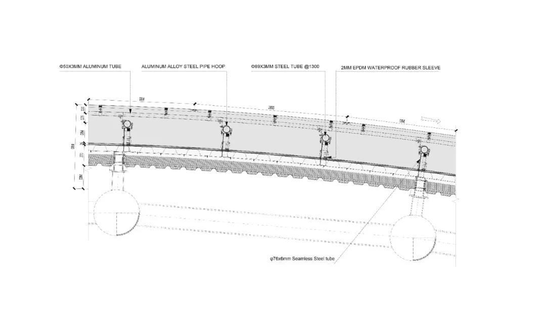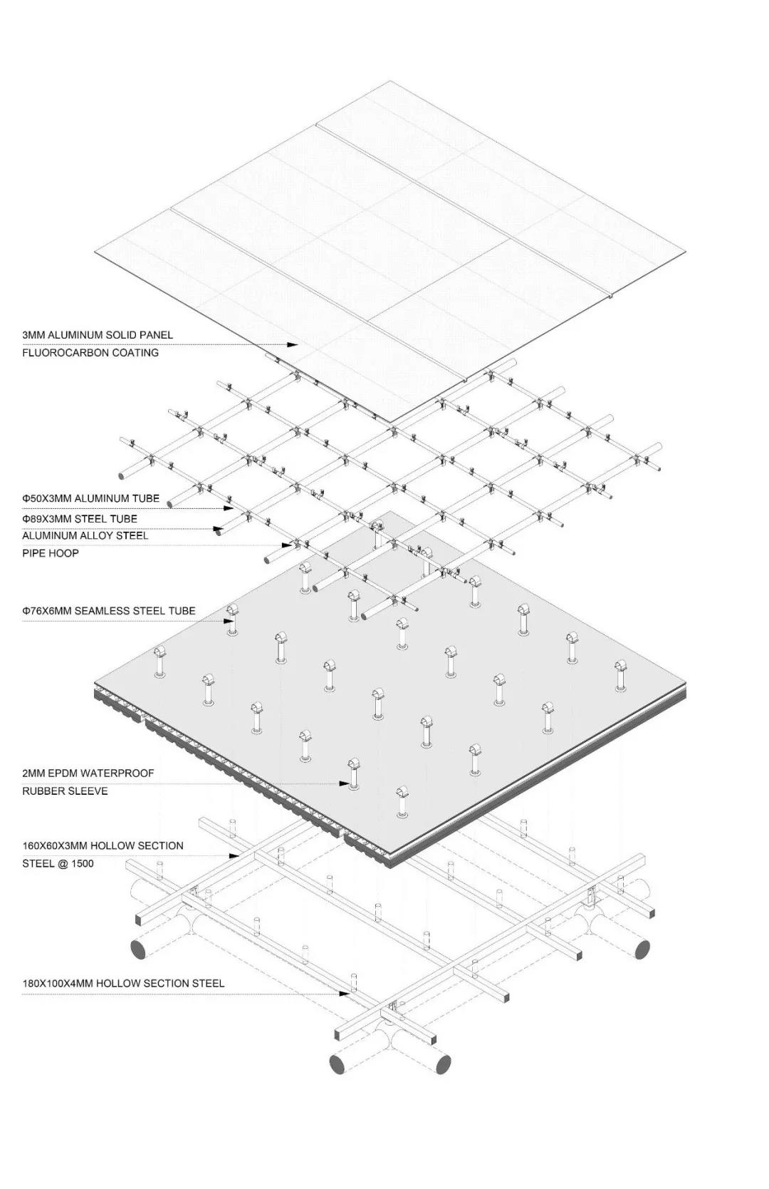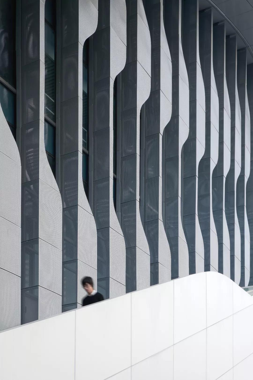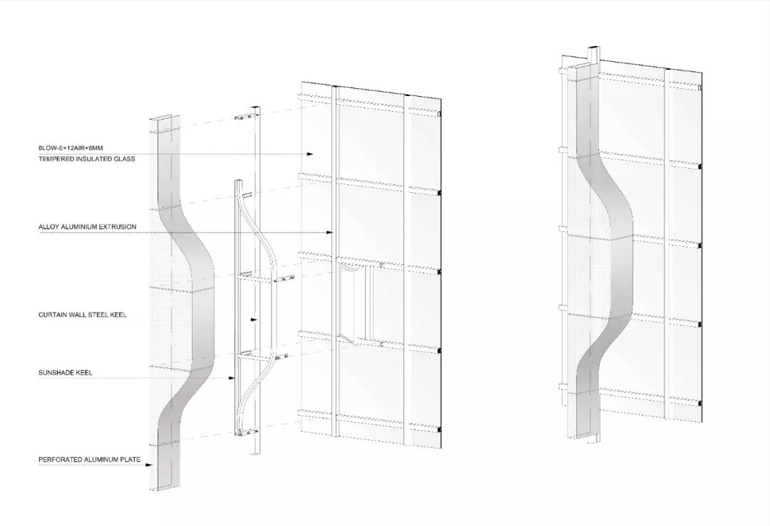我們采用“反轉”的設計理念,將一般設置在室內的幕墻擋風桁架反向安裝在整個玻璃幕墻之外,并與穿孔鋁板外遮陽系統合二為一。同時,將通風窗巧妙隱藏于遮陽龍骨之中,既減小了幕墻結構體系對空間的占用,又避免了通風窗開啟時對整體立面效果的影響。