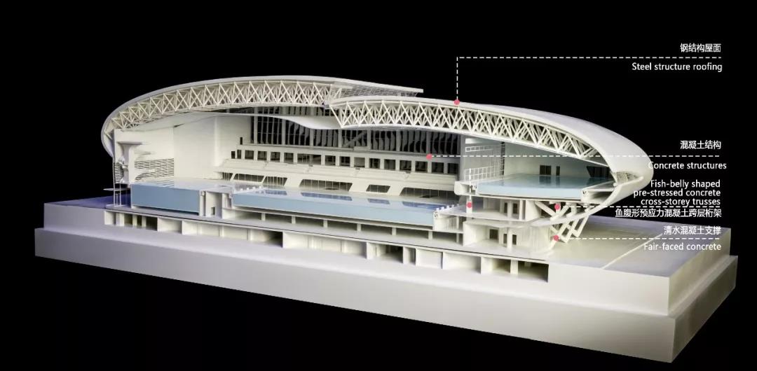 游泳跳水館上部主體結構為大跨度鋼結構空間網架體系,最大跨度達74m。而整個訓練池結構總荷載達到36400kN,由下部8榀魚腹形預應力混凝土跨層桁架支撐,桁架根部進一步由6榀V形清水混凝土柱支撐,并向南部懸挑達12m以上。同時,設計充分利用混凝土跨層桁架的內部空間,合理組織結構構件,將運動員休息廳及更衣室功能空間設置在其中。