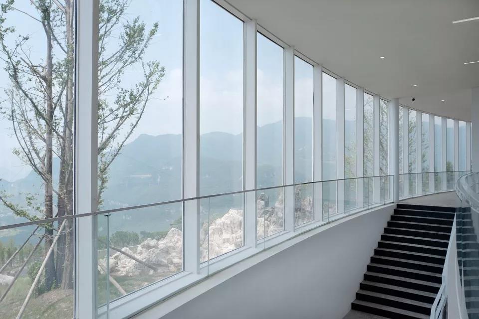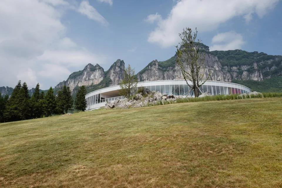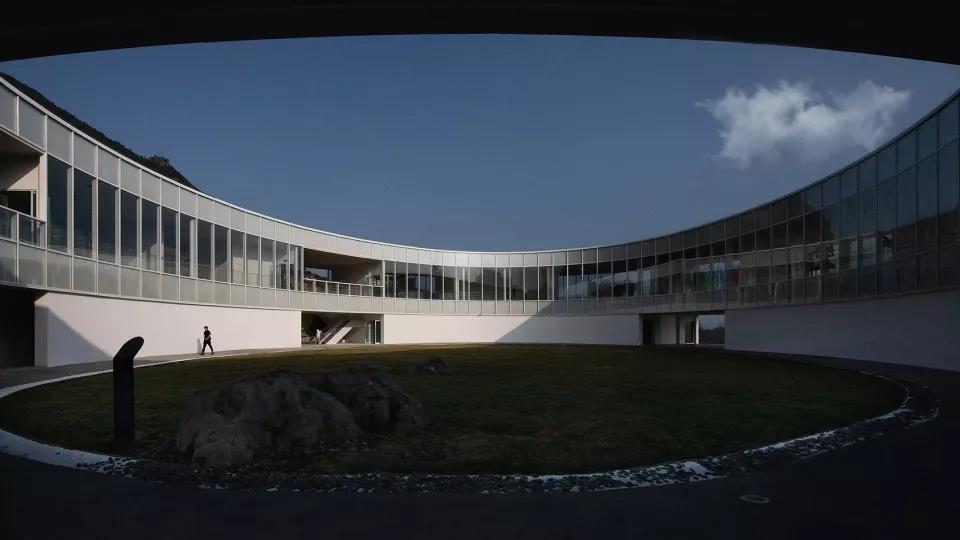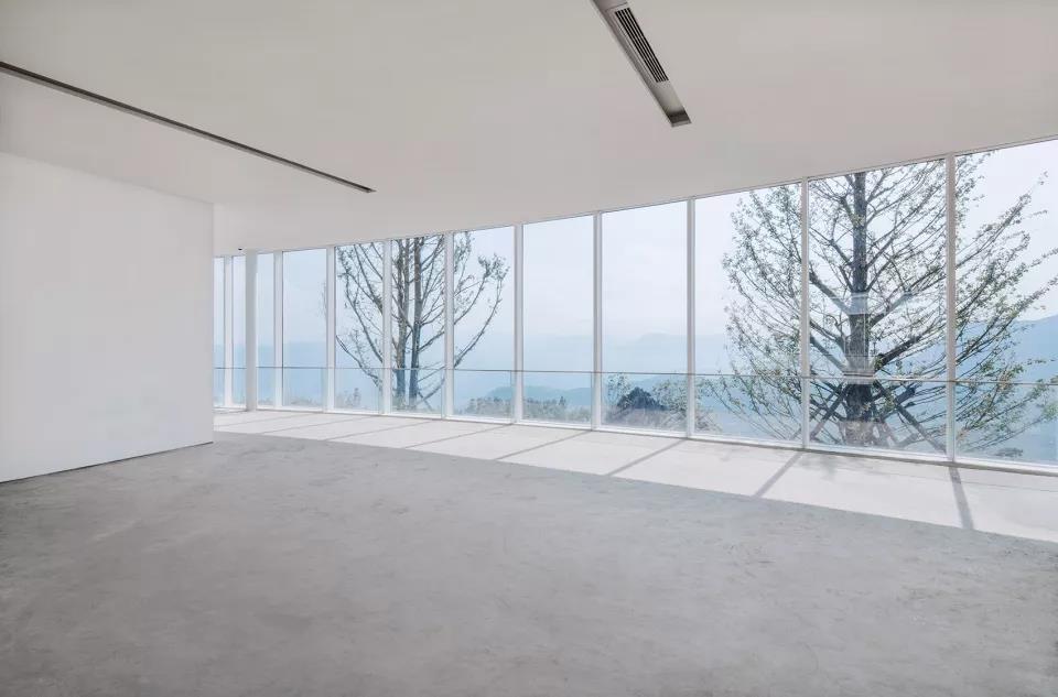 橢圓環(huán)形主展廳使用了大片的玻璃幕墻,人們在欣賞大地藝術(shù)作品的同時,可以從360度方向感受山中風(fēng)景,趕上起霧的天氣,如同漫步于云霧中,更能夠獲得完全置身于自然之中的體驗。參觀者來到中心庭院參觀、休憩時,會發(fā)現(xiàn)橢圓環(huán)形的建筑邊界把天空風(fēng)景限定在一個固定的畫框里,好像一件大地藝術(shù)作品。