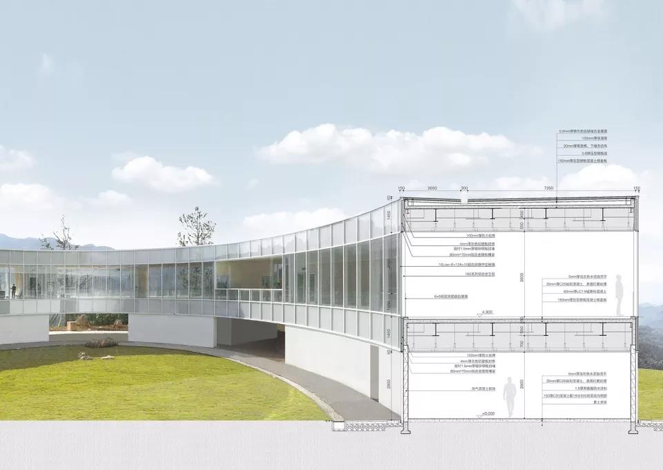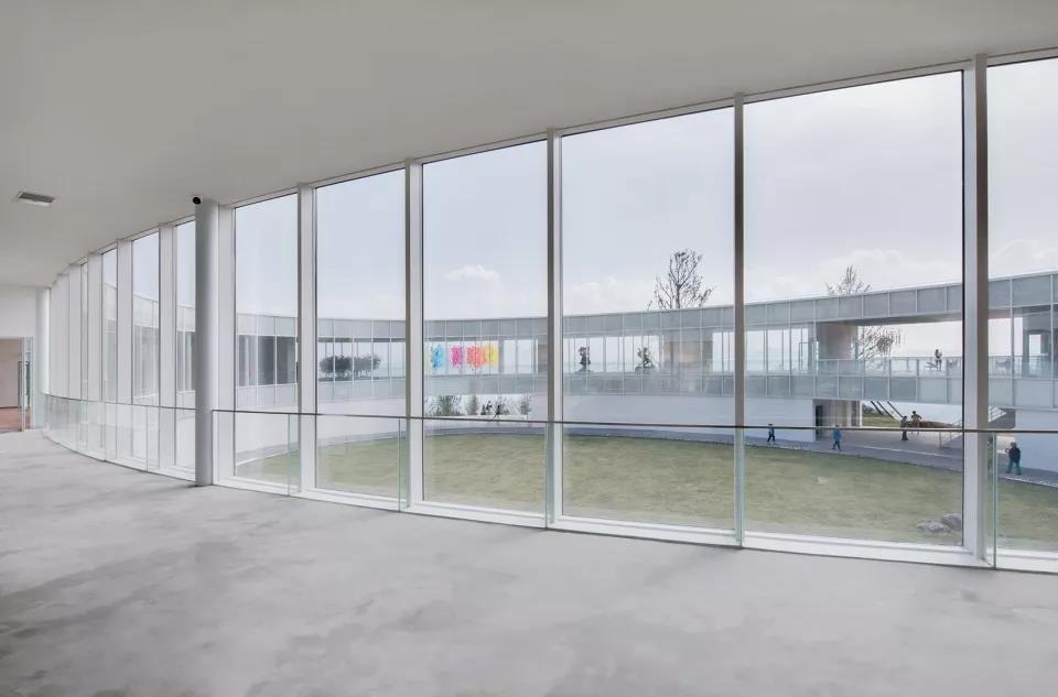 通過首層功能體塊分隔出的灰空間,人們可以隨意進(jìn)出中心庭院,如同穿梭于自然之中,模糊了建筑的界限,也減少了其對自然和人的壓迫。建筑師將主展廳內(nèi)部的剪力墻與展示墻結(jié)合在一起,除了可以分隔空間和集成設(shè)備管線,更重要的是讓整體結(jié)構(gòu)顯得更加輕盈,消隱的建筑邊界也使展廳獲得了最大限度的連續(xù)視野。