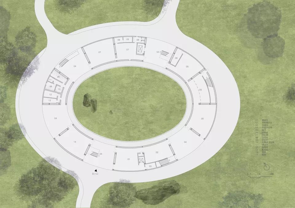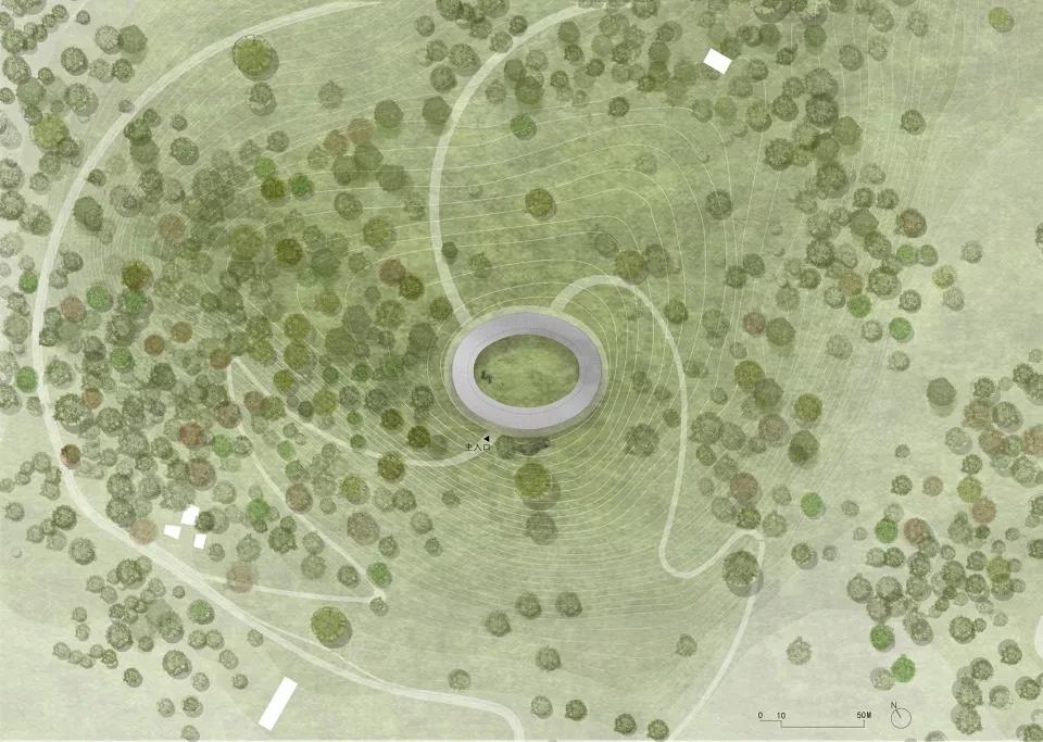 為了回應(yīng)大地藝術(shù)的主旨,建筑師設(shè)計了一個橢圓環(huán)形主展廳,由入口接待、員工辦公、商店和特別展示等4個功能體塊將其托起,并利用山勢消解掉首層的體量感。來訪者無論是從山坡下方仰視,還是在山上的觀景平臺俯瞰,首先映入眼簾的就是橢圓環(huán)形主展廳。整個美術(shù)館從不同角度看都像是漂浮在場地中,尤其到了晚上,在照明的映襯下,更像是一個漂浮在山中的光環(huán)。