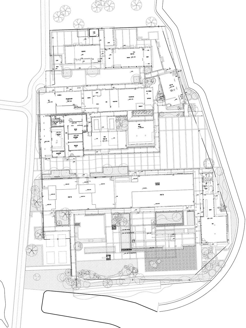 酒廠在半島上,兩側臨水,故意不去設置可以看到“正立面”的視角,即使有可能看到正立面的地方也不設置讓人停留的空間,讓人漫游過后對作為“物體”的建筑觀看的印象幾乎沒有,得到的只是置身其中的居游感。從廠房的尺度,轉為人的尺度;從生產的尺度,轉為居游的尺度。酒廠的出口與入口距離很近,在處理上入口小尺度的圍廊與庭院讓人忽略廠房尺度而順利轉入廠房內部,小廣場上與人同高的酒壇遮擋住視線。待到參觀完整個酒廠,從出口處繞過酒壇方才發覺是進來時的地方,時間的不盡帶來了空間上的深遠。