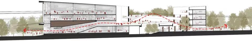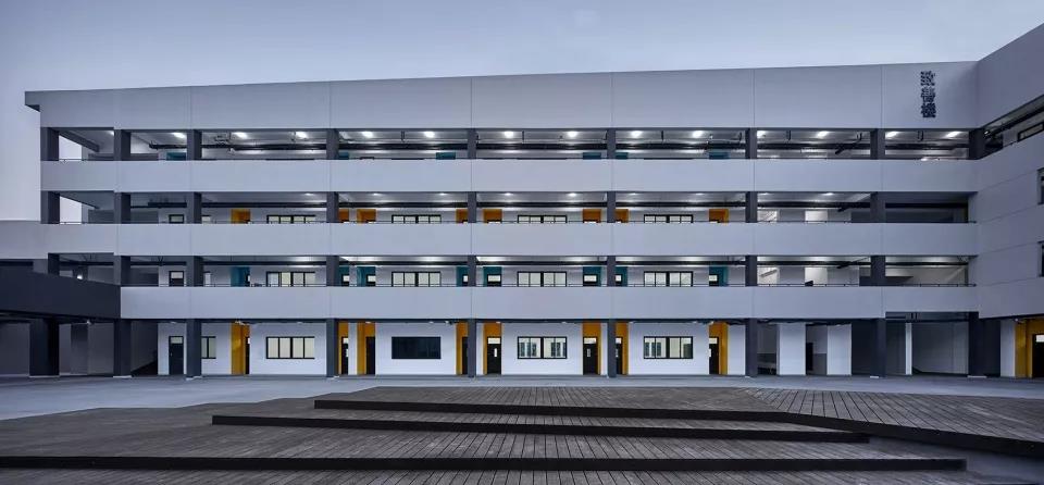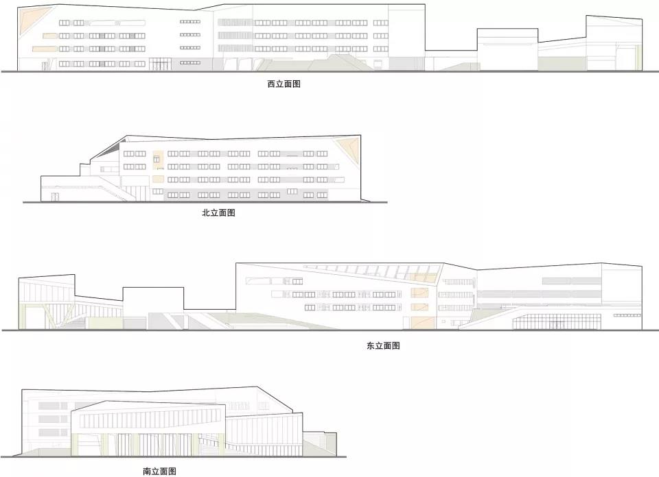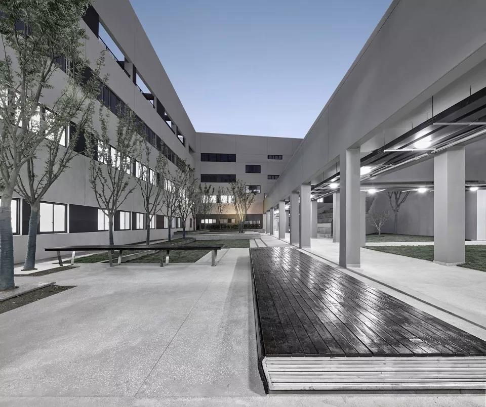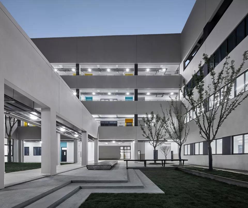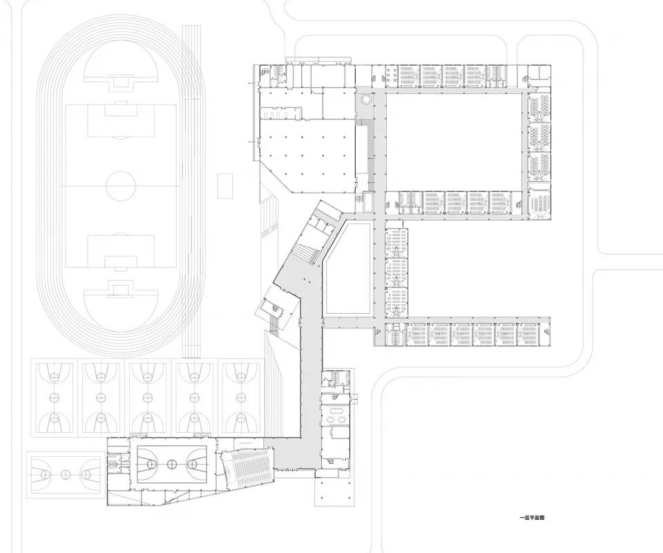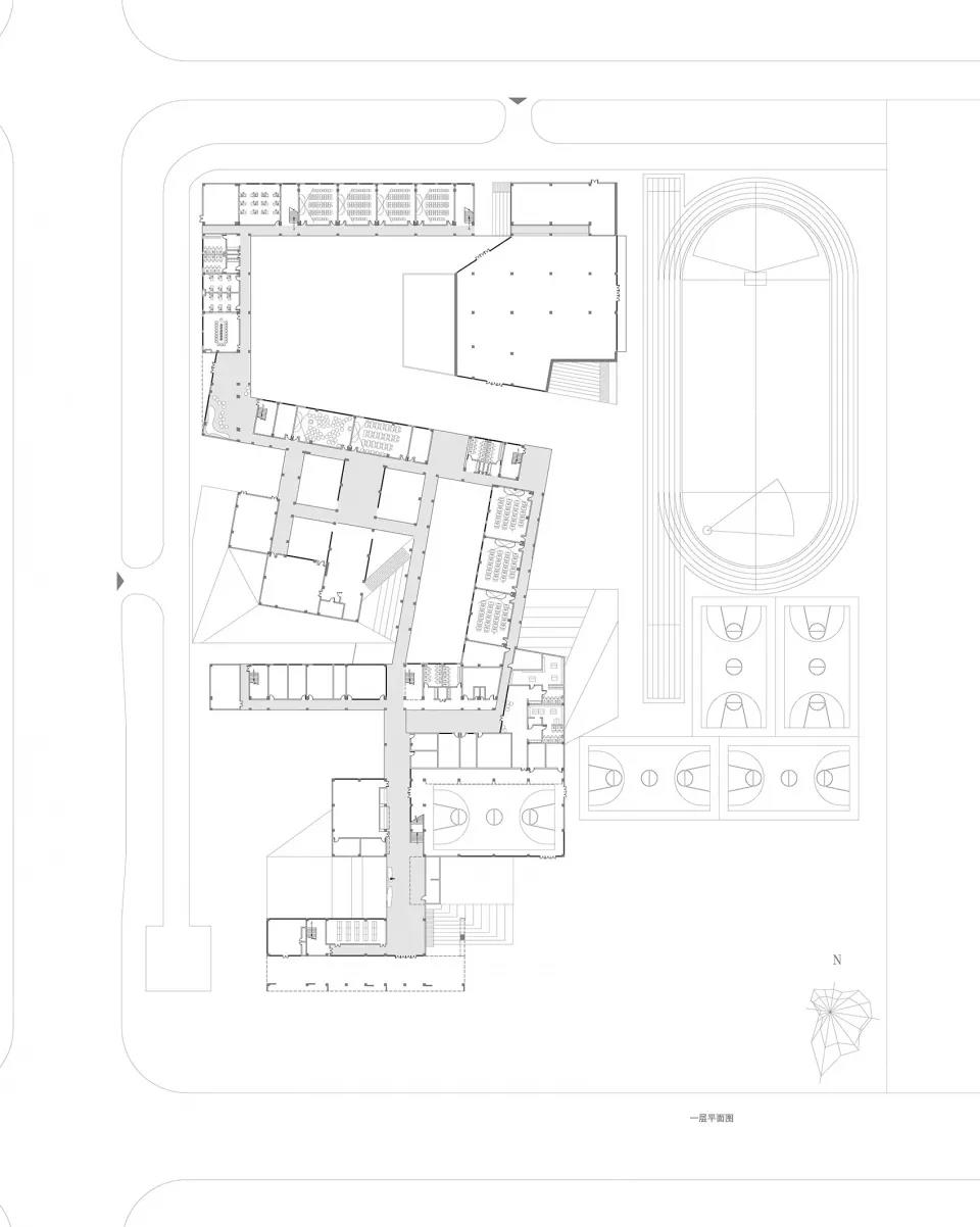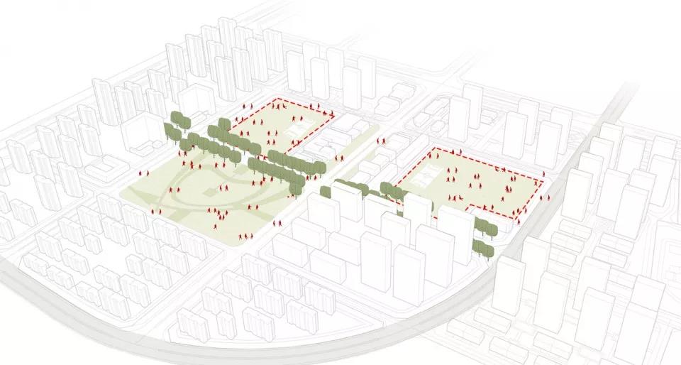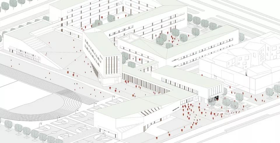中學設計里,將中學前場打開,使其成為城市廣場的一部分,作為社會生活與學校活動的“緩沖空間”,校園前場“場景”功能的變換,消解了內與外的邊界線,使得校園與社區的互動成為可能。