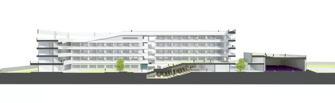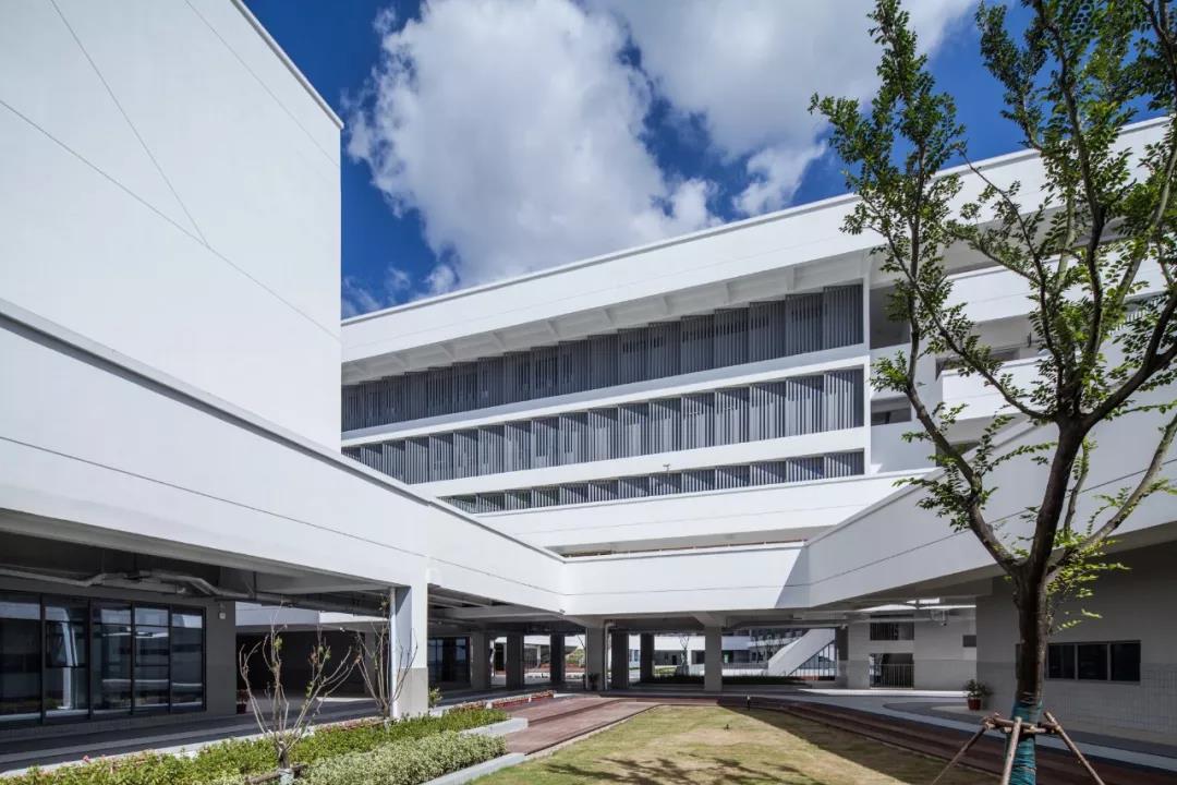 教學辦公綜合樓南北側教學組團與東西側辦公組團圍合形成的中央內庭院,是整個建筑中最活躍也是最重要的景觀節點,其通過教學樓西側平臺下的灰空間與運動場相連,更是在建筑一層形成開敞連續的室外活動場所。