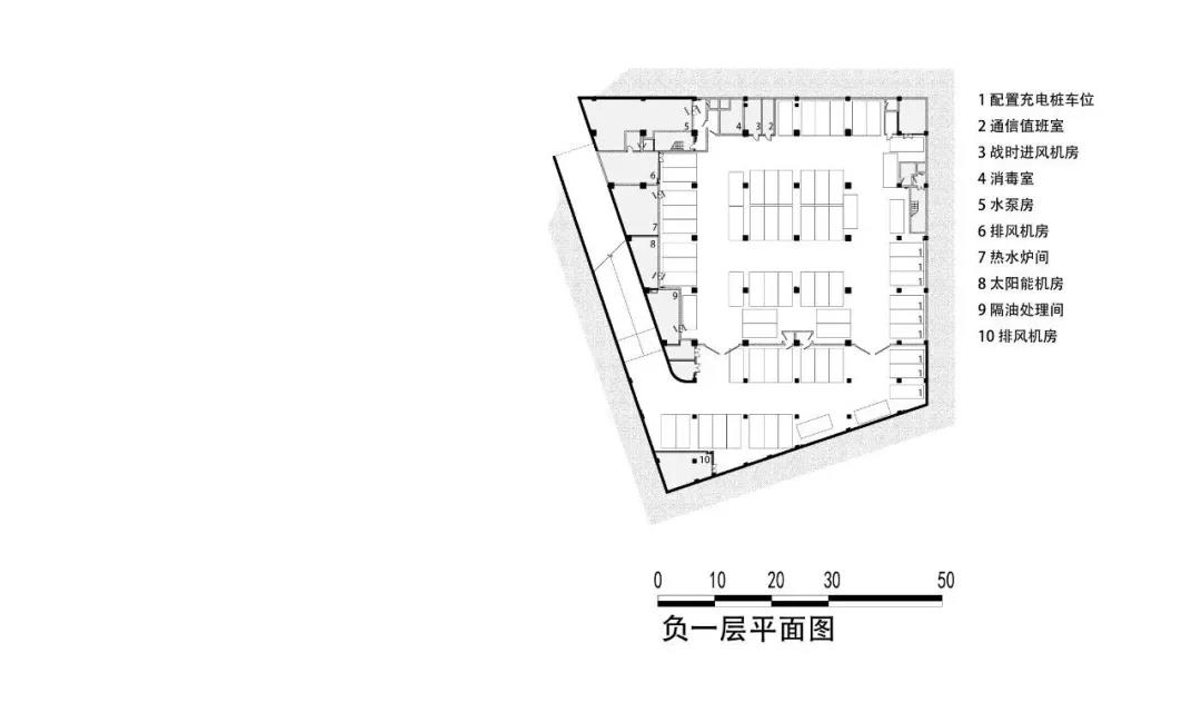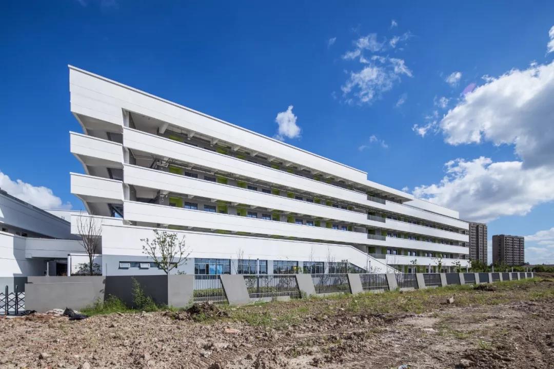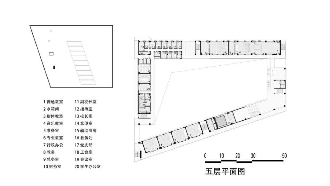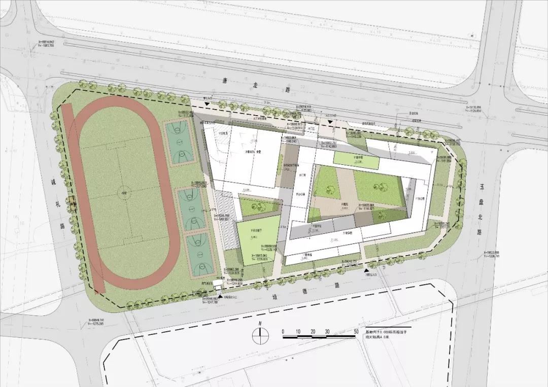 唐城初中建筑面積約22763㎡,為32班中學。其中地上五層,地下一層,包括教學及輔助用房、辦公用房、生活用房等。項目設計采用圍合式建筑形態結合建筑內部多樣的共享空間,突破傳統學校的布局模式,是我們在現行規范限制下對學校設計的創新嘗試。