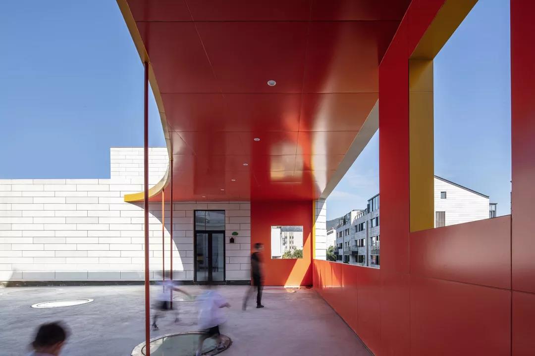 色彩作為一種媒介,調合了建筑與外部環境的各種矛盾的因素。在一層挑高的大廳,我們設計一個橘紅色的盒子,這是屬于孩子們自由的空間,同時激發整個空間的幻想力。在外部我們用顏色來剝離解放原建筑的形式和材料,在內部空間用極簡的形式和色彩與外部融為一體。