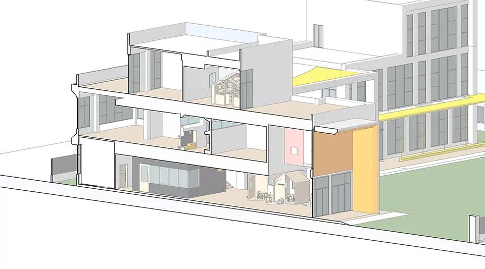 原建筑是由一棟主樓和輔樓組成,建筑嚴肅與住宅相識,我們希望建筑本身可以激發孩子的幻想,和自由意識。因建筑整體無法做大動作的調整,通過“插件”的這個設想的動作,來完成整個建筑上的情感暗示。新的插件語言通過控制性的顏色模糊了實體屬性,讓孩子可以體驗建筑本身,同時提示著幼兒園在街道的位置。