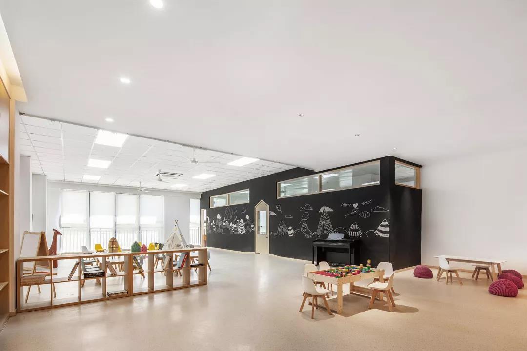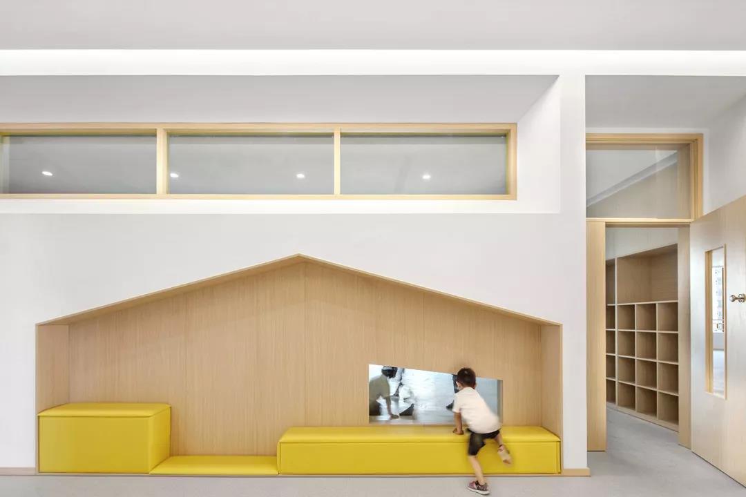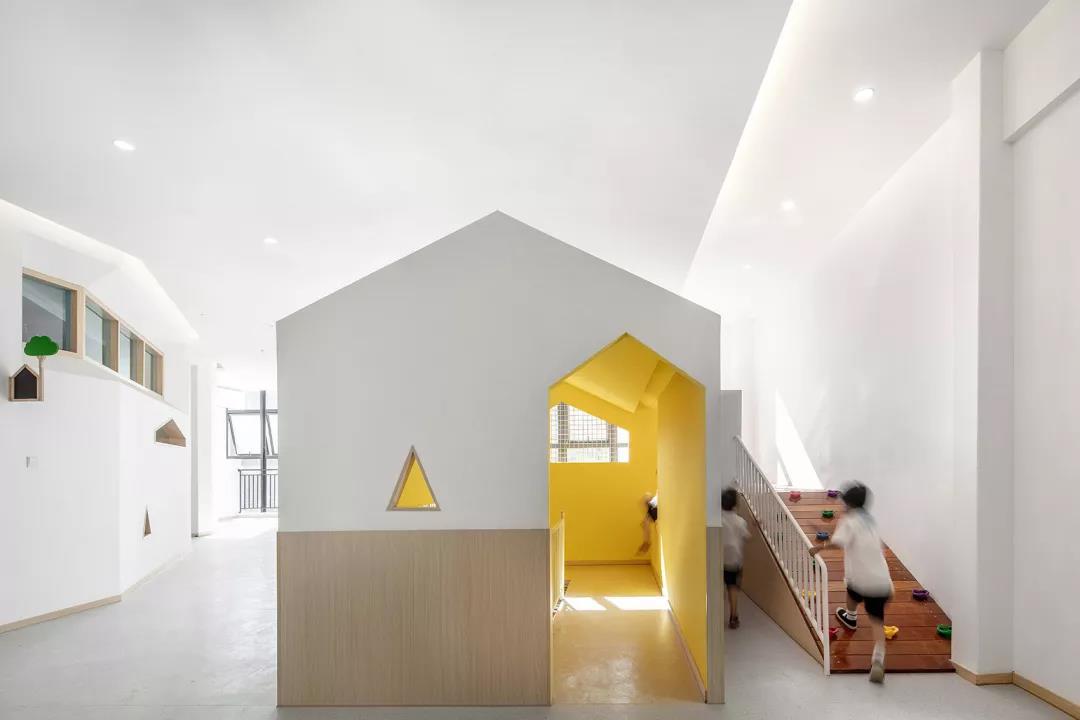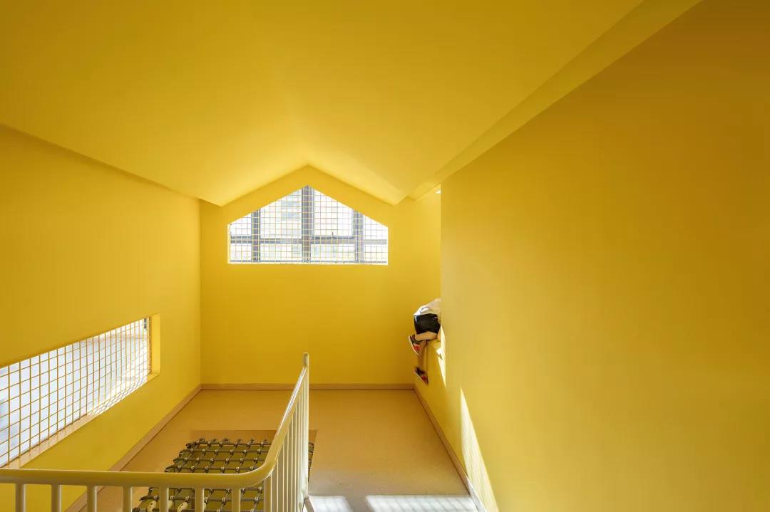 內部空間的重組,給我們帶來新的機會,在內部我們繼續用“插件”這個動作,來完成空間的氛圍表達。兒童空間我們認為最重要的就是激發孩子的幻想,提供屬于一個他們的自由空間。所幸的是,我們發現孩子們喜歡一次又一次的去體驗空間帶來的快樂。為了達到這個目的,我們還在每個教室做了一個只適合兒童的空間,而家長是不適合去的。在一層的大廳有一個彈網區域,變為一個充滿挑戰和好奇的空間,同時還插入一個貫通二樓到三樓的垂直房子,孩子們可以在這蹦來蹦去,來回奔跑,自由玩灑。