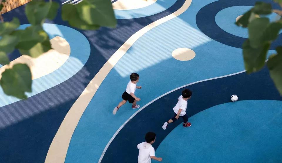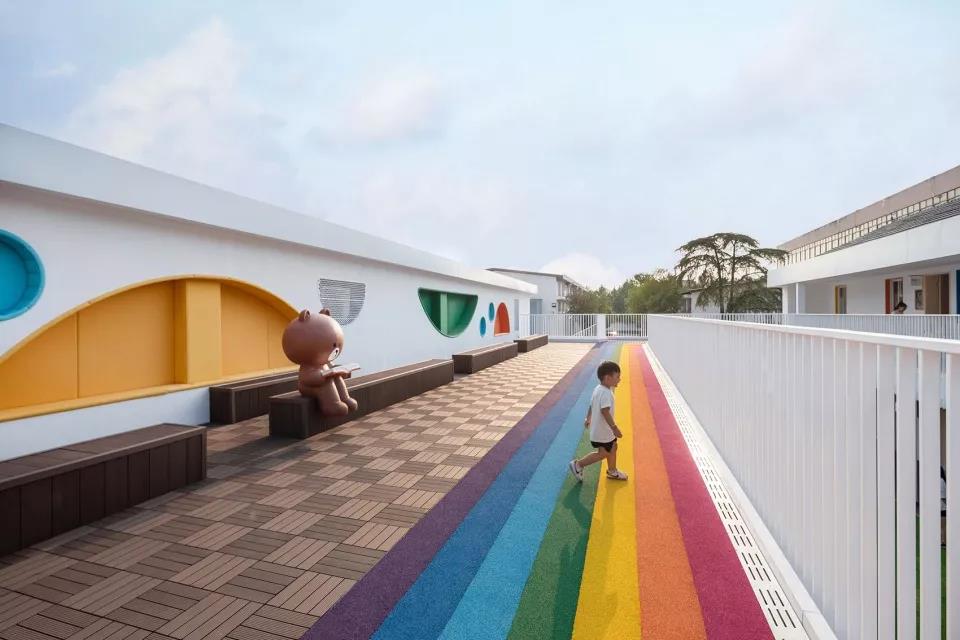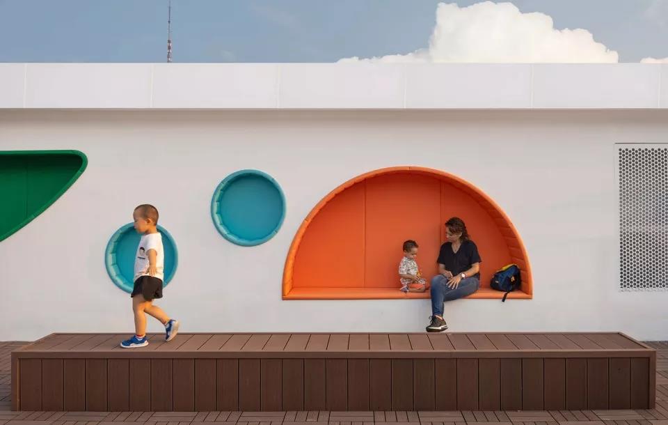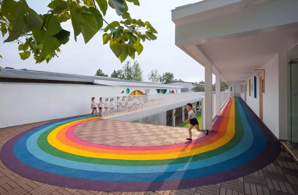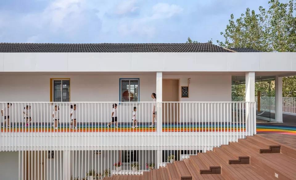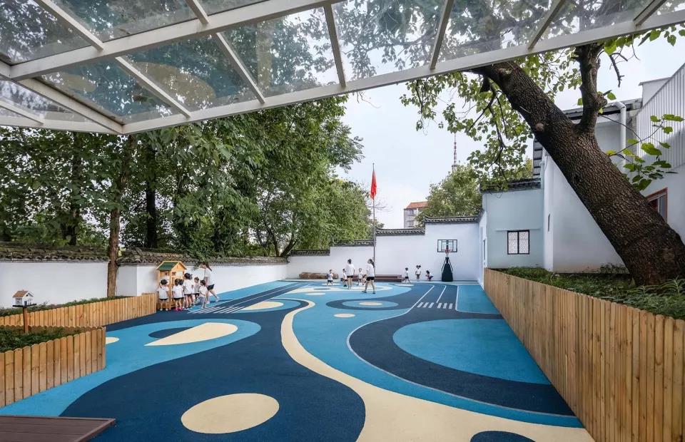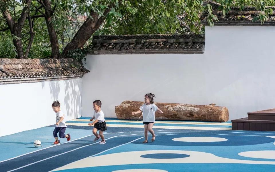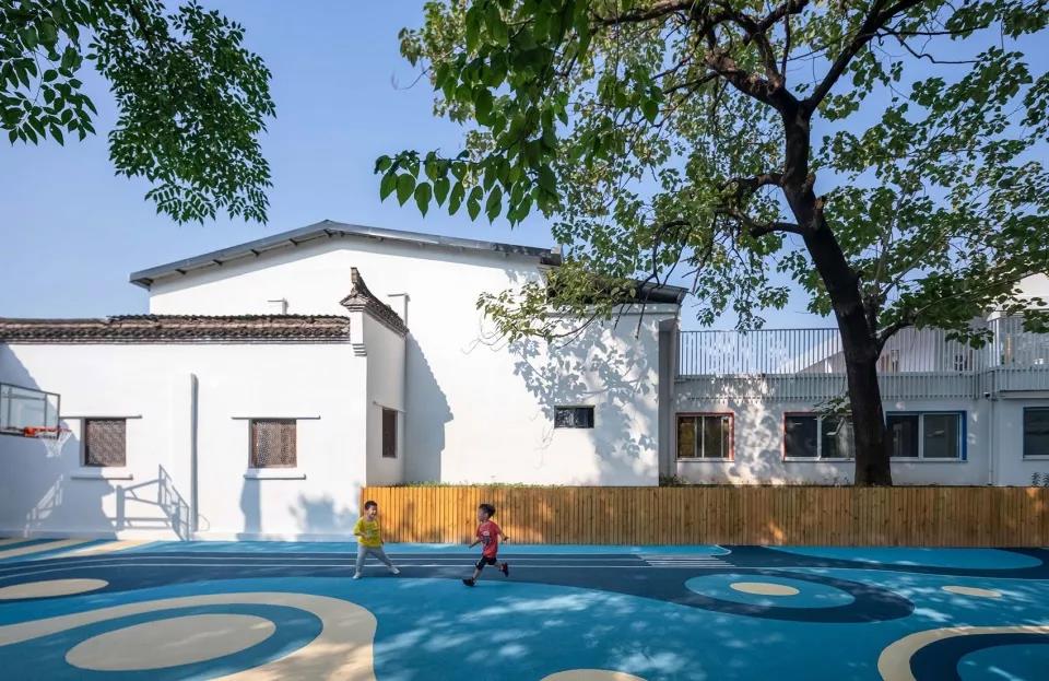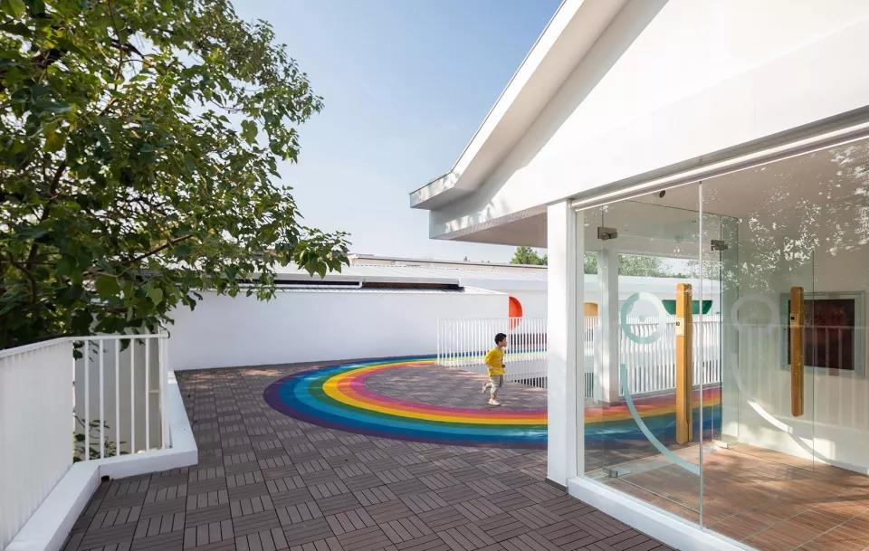 改造后的圍墻立面打破了原來茶室的封閉,增強了園區內外的通透感和連接性,也預示著現代兒童教育的開放性。白色的建筑表皮圍合著整個庭院,而彩色的窗飾序列性的點綴其間,建筑變成了一個自由而溫暖的“家”,讓孩子在其中奔走不停。在外部的城市界面,原先的白墻黛瓦被保留下來,精心修復,與游戲場地地面所用藍色弧形色塊分割構成了歷史與未來的某種暗喻。從前期的現場勘探,到方案落地,包含著ZAN建筑團隊里每一個人的辛勤付出。如今,屬于上個世紀的陳舊茶室已剝去了歲月的殘殼,蛻變成一個面向二十一世紀的生機勃勃的早教中心、一個盛放童心童趣的容器。當看見孩子們在彩虹里縱情奔跑、步履不停之時,關于中國未來的生命力和想象空間,得到了不容置疑的最新詮釋。