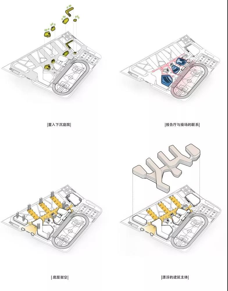風雨無阻的行走空間與觸手可及的景觀資源相結合,形成一個適合學生們活動的開放式教學大公園。各功能建筑體量從二層開始堆疊,漂浮于公園之上,削減了笨重感,顯得活潑有趣。