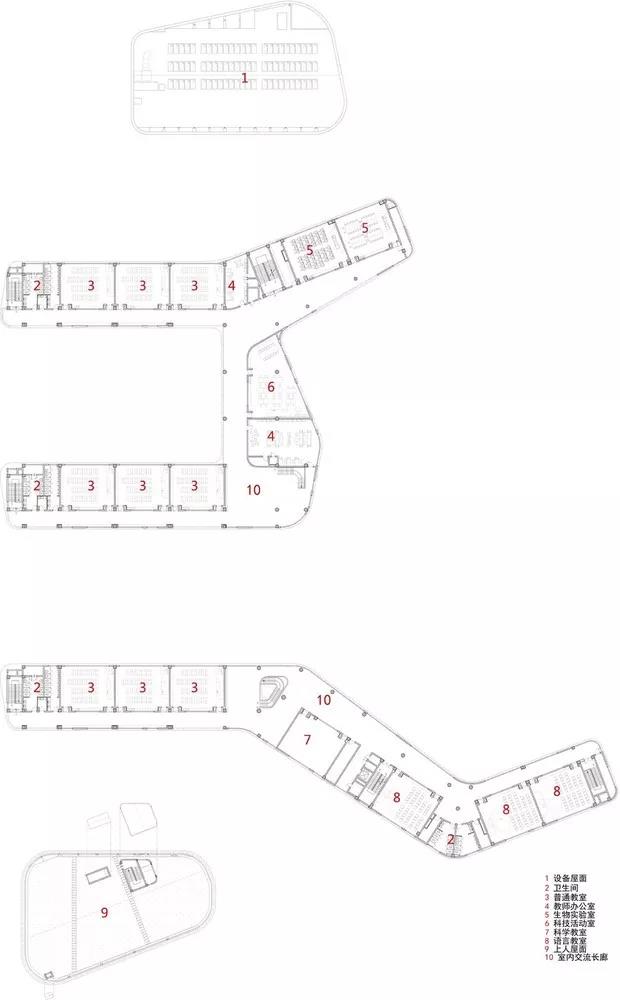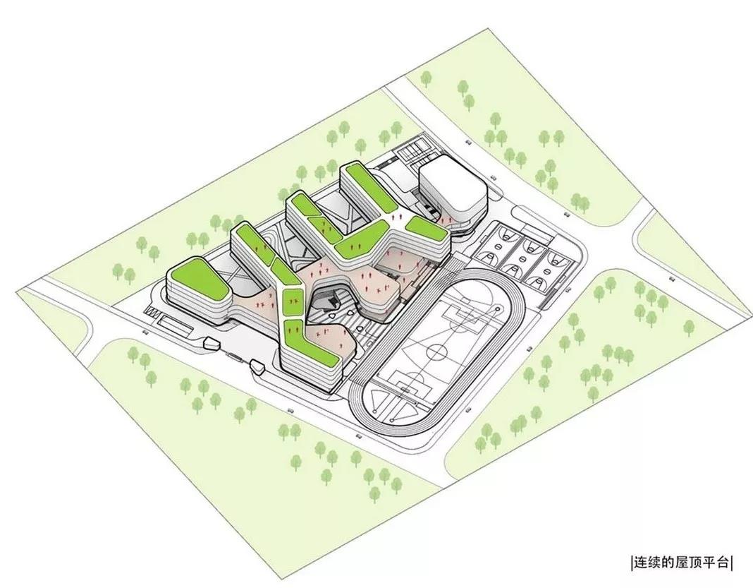 為了最大限度地將“陽光、綠地和空間”融入校園,采取架空、穿插、拼疊、錯動、屋頂花園等手法,使建筑本身成為聯系校園眾多功能及區域的紐帶。多標高的屋頂平臺也被賦予了不同的使用功能和教學意義,在豎向上也豐富了校園的第五立面。