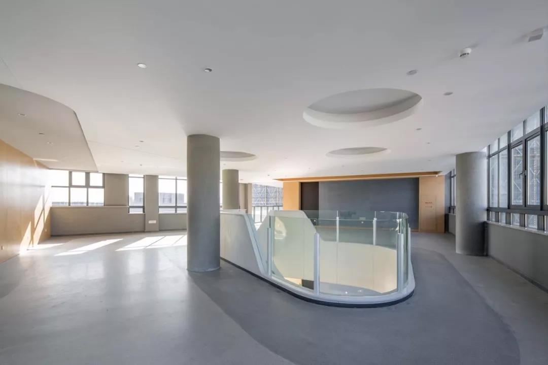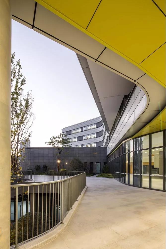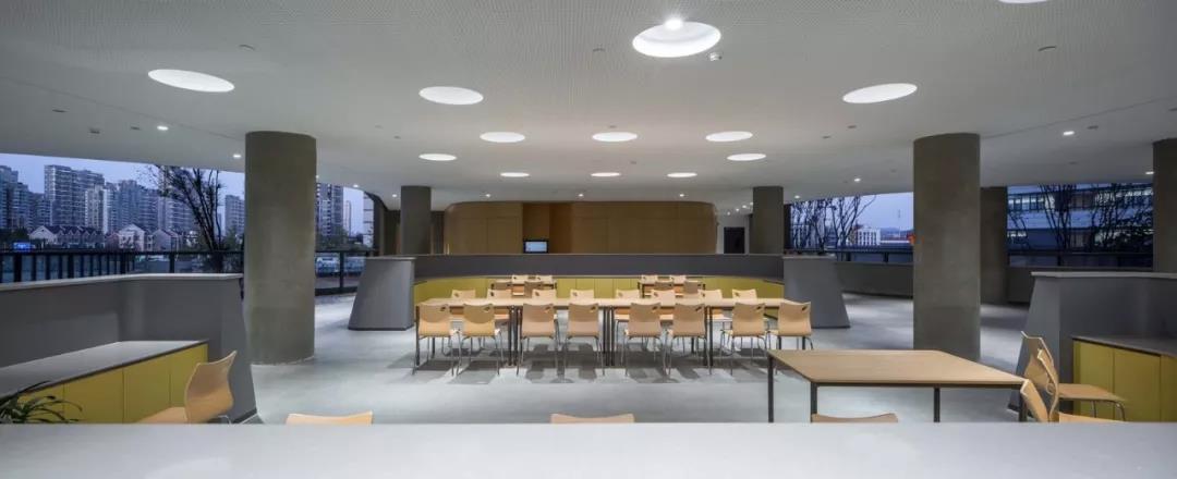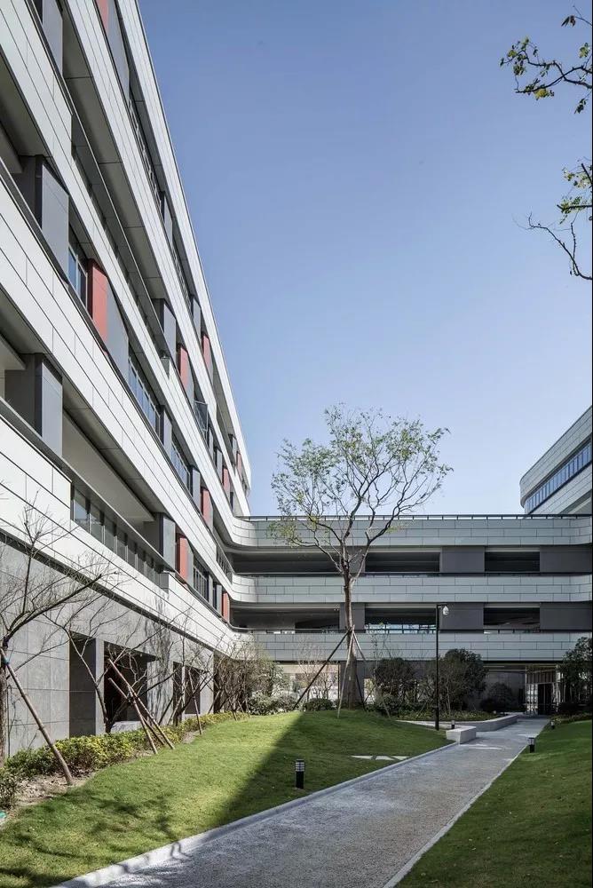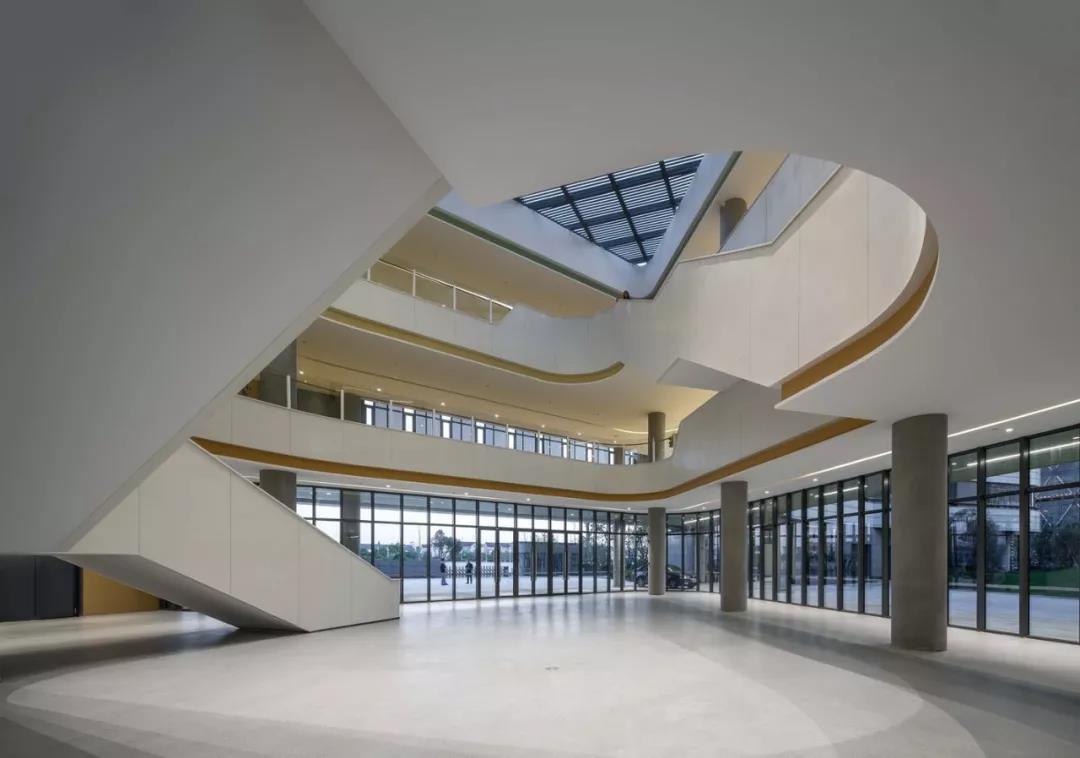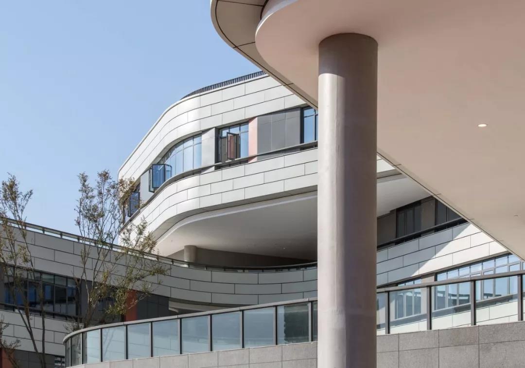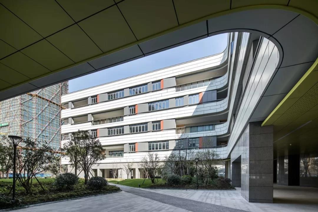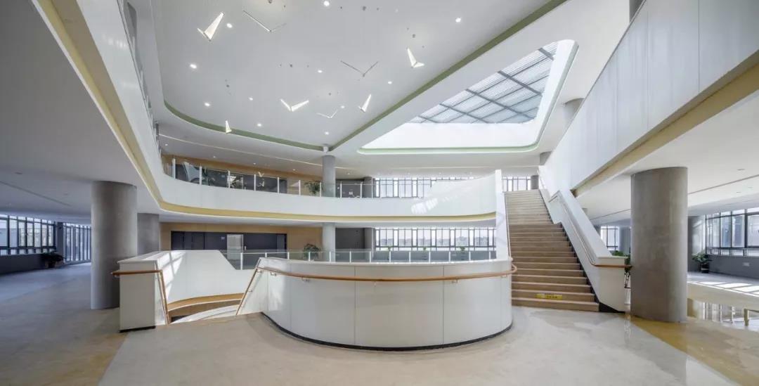 通過明暗對比和細部處理,體現簡約而生動的建筑組合,以多層次、多維度的立體校園,賦予與杭州濱江區智慧新城相協調的新時代當代校園的建筑特征。綠色調的蜂窩鋁板吊頂搭配清水混凝土柱的架空層,是室外綠化景觀的空間延續,可以消除學生的緊張心理,活躍空間氣氛,促進學生身心健康發展。