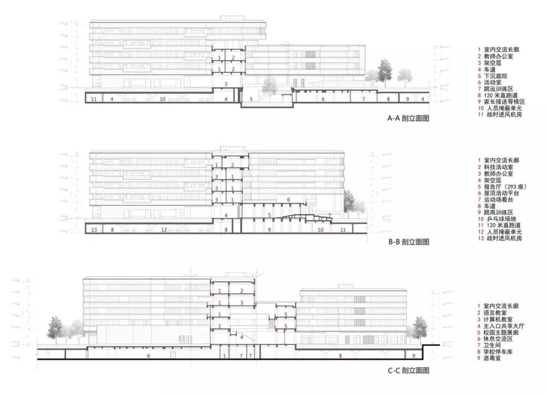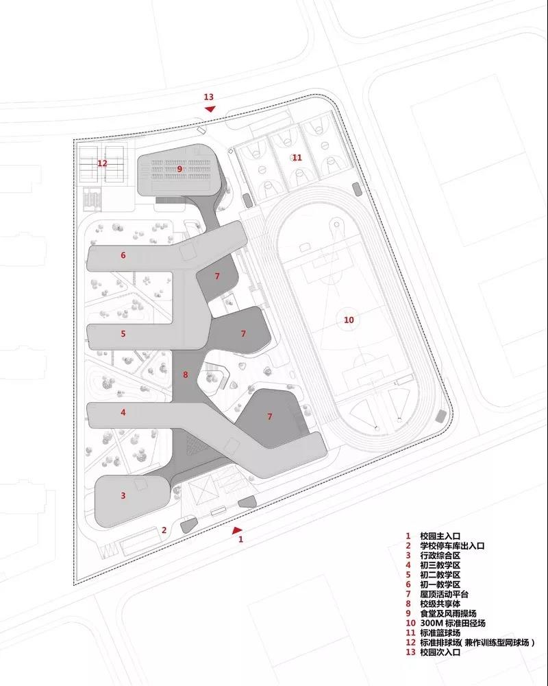 食堂、風雨操場、教師辦公等輔助活動空間的公共性最強,布置在校園南北兩端,交通便利并為核心教學區起到盾牌的作用。