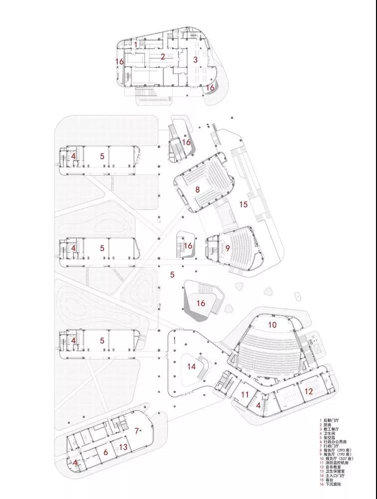 自由靈活的建筑功能布局為建筑的使用方式及流線組織賦予新的可能,教學參與者的交互不止于教室中,更存在于校園空間的每一個角落。設計將校園核心教學區域底層整體架空,僅由引導性豎向交通空間與三個不同規模的報告廳組成。