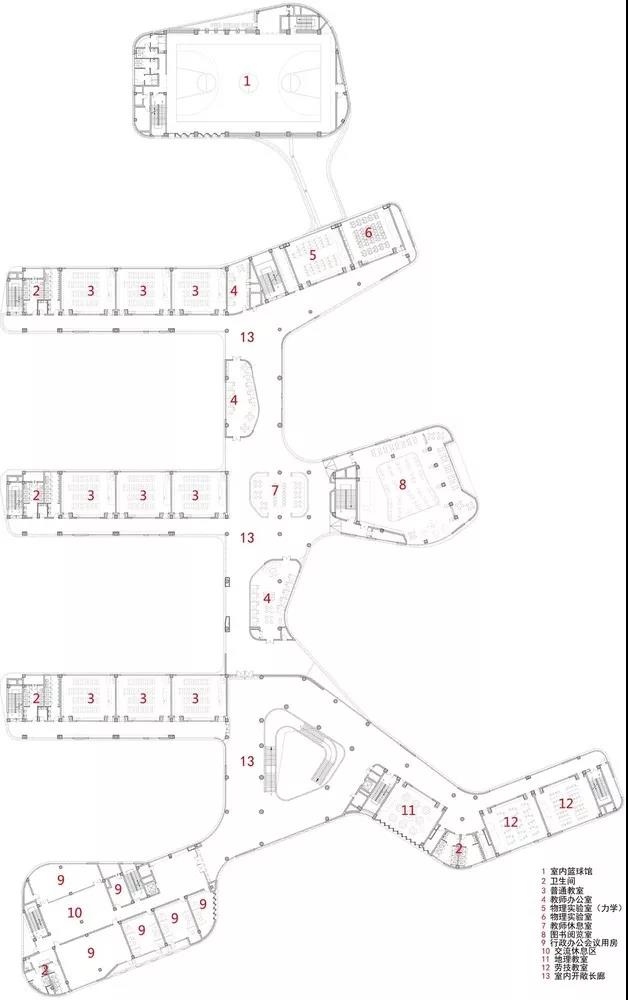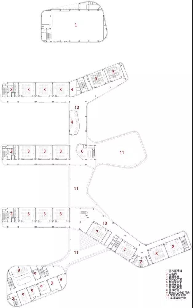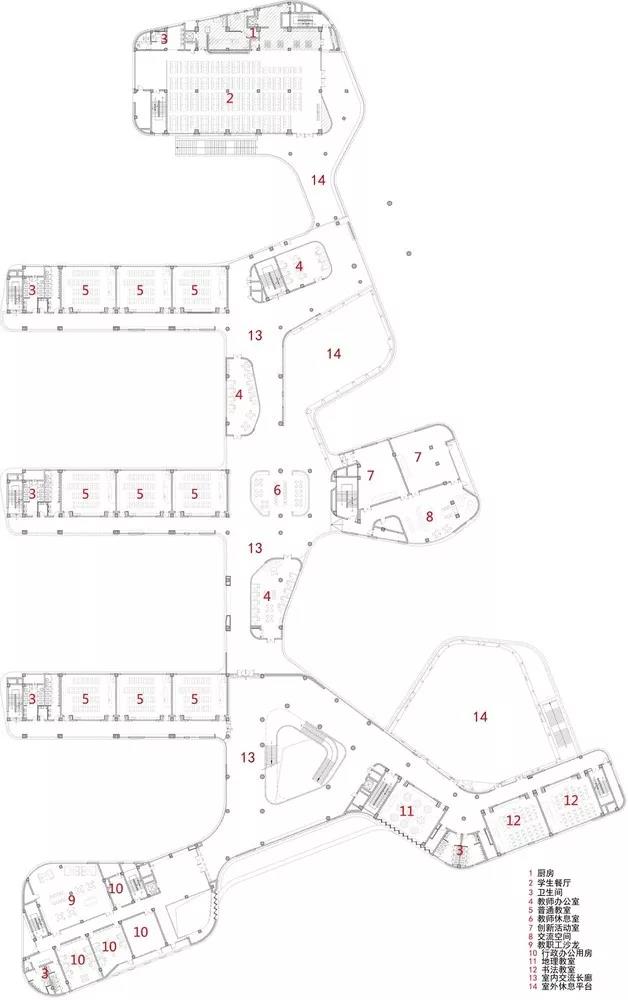普通教室作為校園建筑中最基本的教學單元,是學生日常停留最久、使用最頻繁的空間。被置于校園內部最安靜,交通最便捷的核心活力軸西側。專業教室、圖書室、報告廳等教學輔助用房,置于活力軸東側,保持與普通教室的緊密聯系,而這些連接部位是設置個人或小組非正式學習的最佳場所。