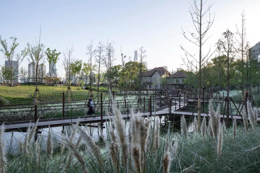 采用有限介入、低沖擊開發的策略,在尊重原有廠區空間基礎和原生形態的基礎上進行生態修復改造。在防汛墻后腹地較大區域原本是一片低洼積水區,水生植物叢生,我們保留了原本的地貌狀態,形成可以匯集雨水的低洼濕地。大雨時能起到調蓄降水、滯緩雨水排入市政管網的作用。