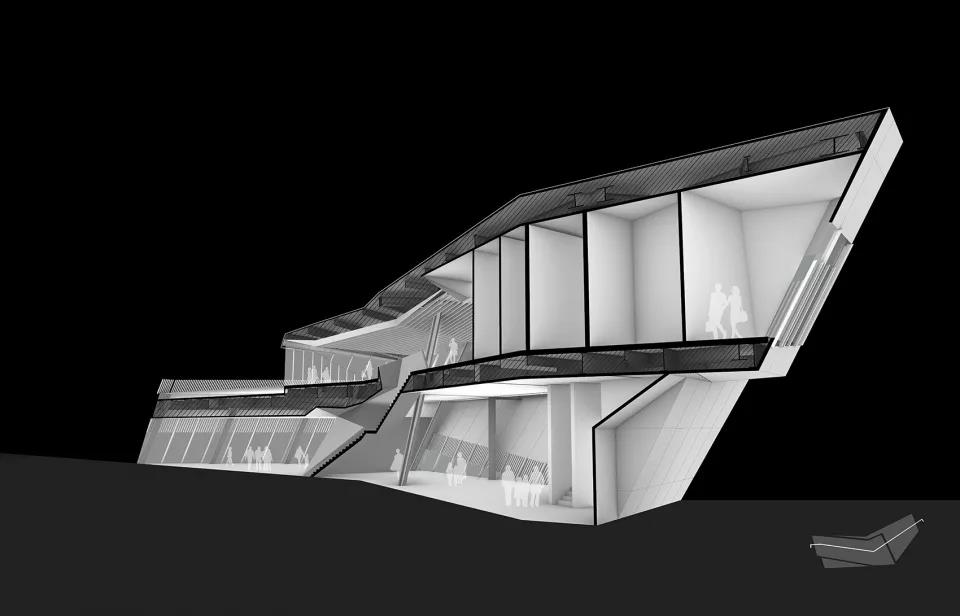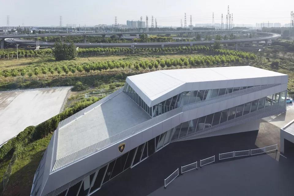 其設計靈感來源于蘭博基尼經典車型的造型迭代,整個建筑利用與場地約60度的傾斜角造型呈現強烈的動勢,并通過形體的扭轉營造出的空間變化。設計與環境充分呼應,為場地注入了新的活力,形成了一個全新的地標。
