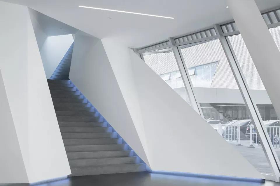 建筑師充分考慮了展廳使用的空間需求和項目的企業文化訴求,通過水平連續和垂直扭轉的設計手法激活了整體空間,外部的形狀由內部體量和交通流線來定義,獨特的立面語言帶來大膽的視覺體驗,簡明而有力的設計引導者來訪的這個巨大的“超跑”空間之中自由穿梭探索。
