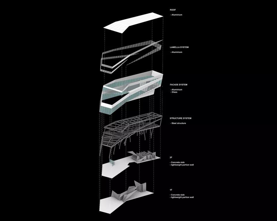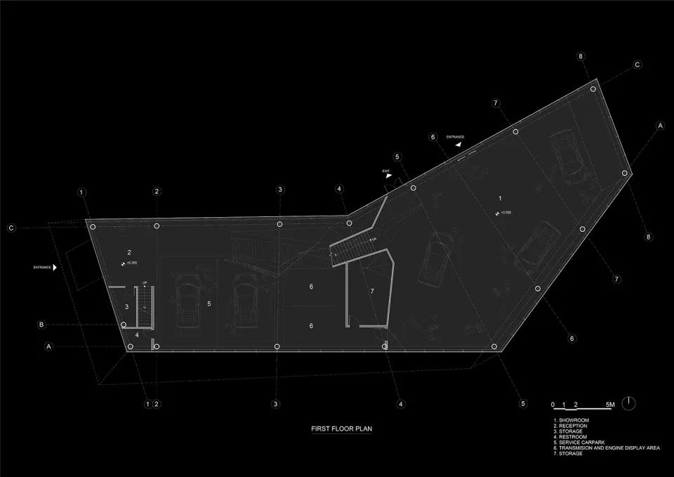 建筑包含四個主要功能空間:新車展示區及保養維修區, VIP休息區和管理辦公區。建筑從正面看去立面向后傾斜,將來訪者引導到建筑前廣場,兩個平面體塊的內凹轉折形成入口緩沖區和大門。新車展示空間通過斜向的落地玻璃幕墻強化標識性,傾斜的立柱在室內形成更有張力的動態展示空間。保養維修區巧妙的使用流線的轉折,將服務入口隱藏在建筑西側,并通過二層懸挑創造了功能性遮蔽。