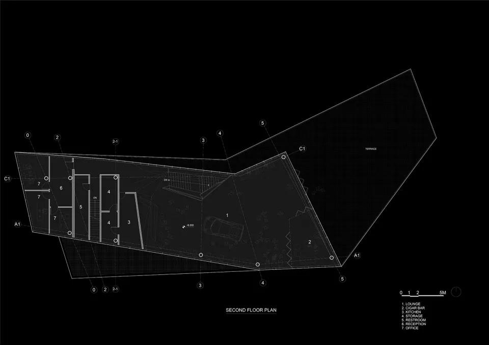 室內由連續轉折三角面包裹的室內樓梯將來訪者引領通往二層VIP休息區,二層室內延續了樓梯設計語言,由三角形轉折面組成的室內墻面兼具了裝飾性和吧臺收納功能。在二層末端的是管理人員辦公區,連續表皮在此處的轉換為辦公空間提供了足夠的采光以及良好的視野,將視線引向附近的開闊空間和綠地。同時,由體塊錯動而創造出的二層室外平臺為為來訪者提供可以一覽周邊景觀的觀景平臺,也為新車發布和品車酒會等活動提供了擴展的可能性。