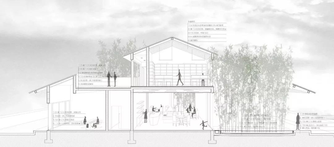 為實現屋檐處8米的懸挑,采用了混凝土梁挑鋼梁的形式;屋面下再用處理過的細竹吊頂,提供一種溫暖的尺度和微妙的光線折射。與此相對應的,建筑的外墻采用了黑石子水刷石的處理,地面采用素混凝土打磨,目的是將光線控制在一個明凈柔和的狀態,從而使屋頂的尺度與人的關系更加明確。墻面水磨石的尺度和分格,暗示了竹節的紋樣,與屋頂和天井景觀構成了自然、人工、抽象,三種竹意向的對話。