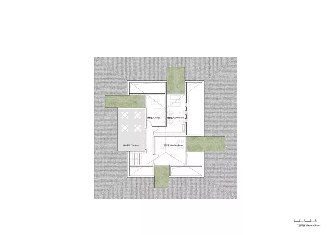 文化大院的設計用一個占滿用地范圍的四坡瓦屋頂來統領結構、材料、細節和功能的發展。我們在屋頂的四坡分別打開四處天井,和一層分居四處的輔助空間相互呼應,為屋檐下的入口營造了看似無意識但十分流暢的進入方式;修茂的竹子從天井中生長出來,為一層核心空間和二層各房間提供景觀和與自然的親密度。