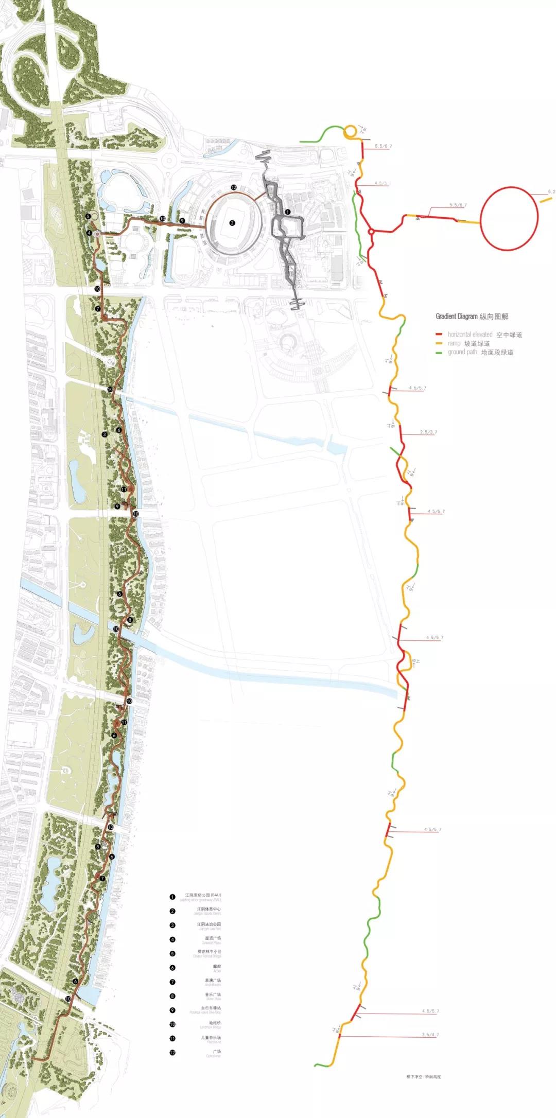 長江是一處舉世矚目的自然風景。正如多數自然風景一樣,人們身處喧囂的城市,日復一日,美景總是在不經易間被忽略。作為城市基礎設施又一新作,將再次向公眾展現長江氣勢磅礴的特殊風貌。綠色步道已成為長江及支流沿岸眾多城市的常見開發模式,沿著綠道縱向修建多個廣場與露臺。景點放置游客信息板,展示長江輝煌的歷史。