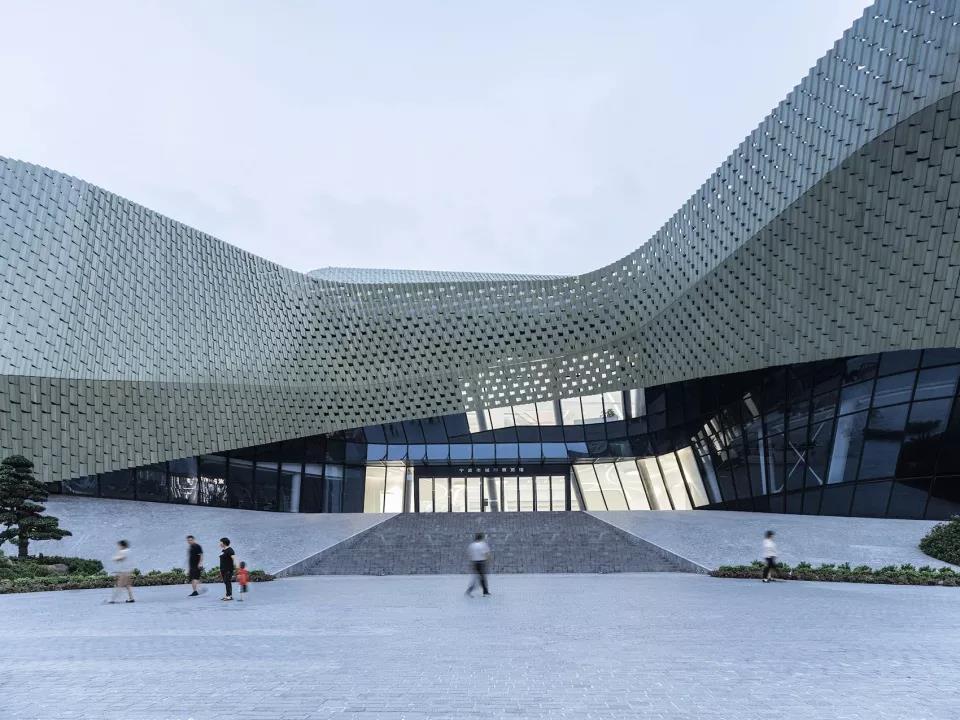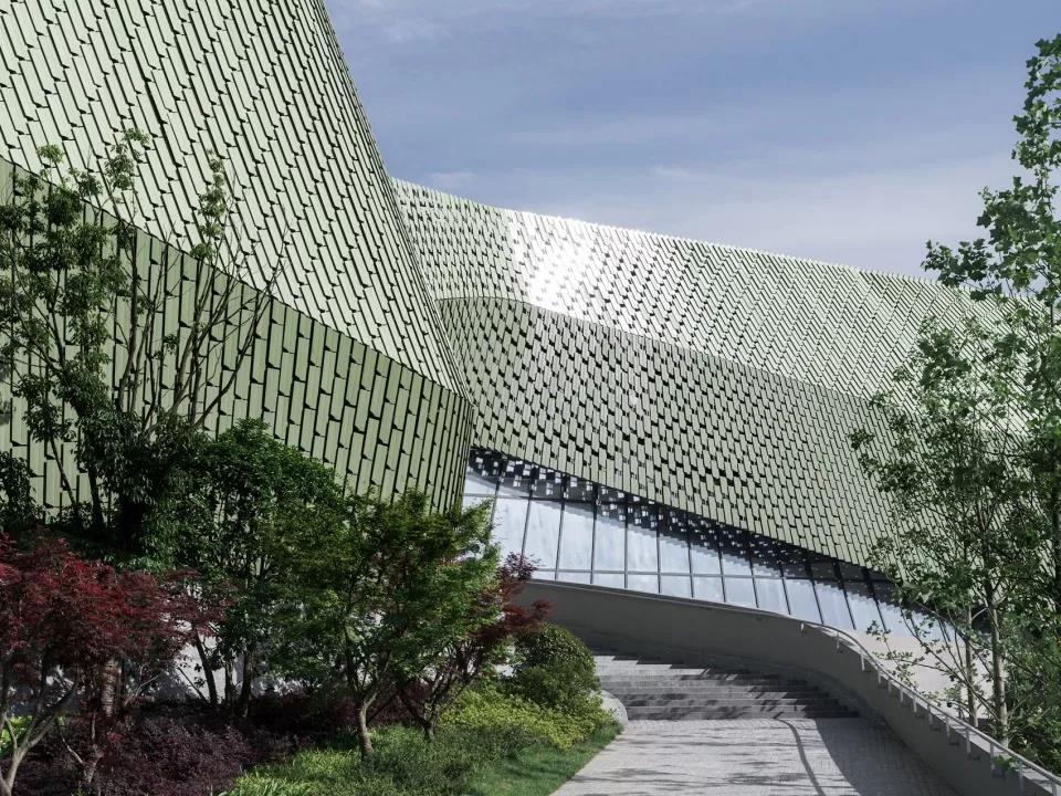 ▼展覽館近景鳥瞰,選擇釉面陶瓷作為建筑表皮