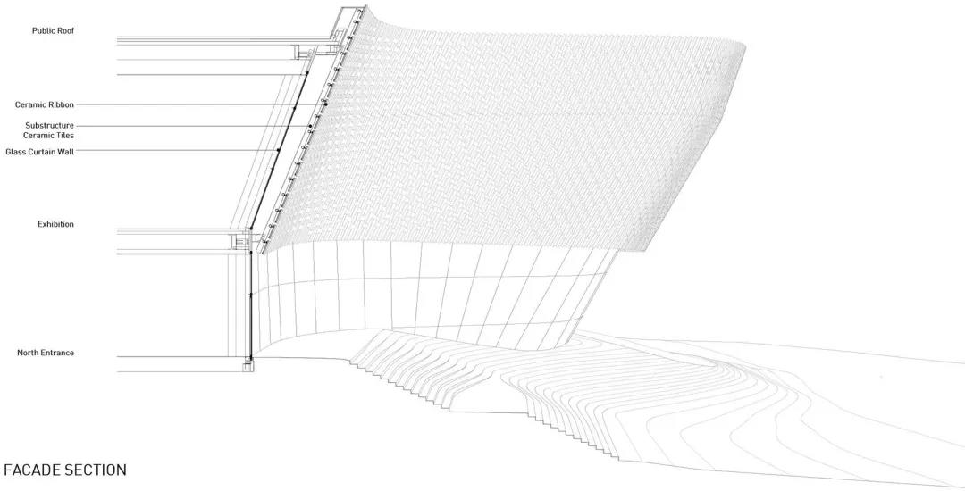 盡管設(shè)計團隊并沒有刻意地在項目中使用數(shù)字化工具,但不得不承認,本展覽館的設(shè)計、開發(fā)和建造都離不開尖端數(shù)字技術(shù)的支持和幫助。為了應(yīng)對主結(jié)構(gòu)體系、幕墻、次結(jié)構(gòu)體系和陶瓷表皮空間分布等的復雜性,設(shè)計團隊必須編寫特定的計算機程序。該程序不僅可以自動生成建筑結(jié)構(gòu)和立面系統(tǒng)的3D模型,更可以針對不同的承包商生成特定的施工圖紙。項目的各方面設(shè)計和施工都通過一個中央的BIM模型進行協(xié)調(diào),為設(shè)計團隊控制和管理建筑的可持續(xù)技術(shù)(如可控的通風系統(tǒng)、雨水的收集和再利用以及光伏發(fā)電等)提供了機會。此外,這個BIM模型還為工程造價預估、項目進程控制、招標、工地監(jiān)管和建筑的未來維護提供了基礎(chǔ)。