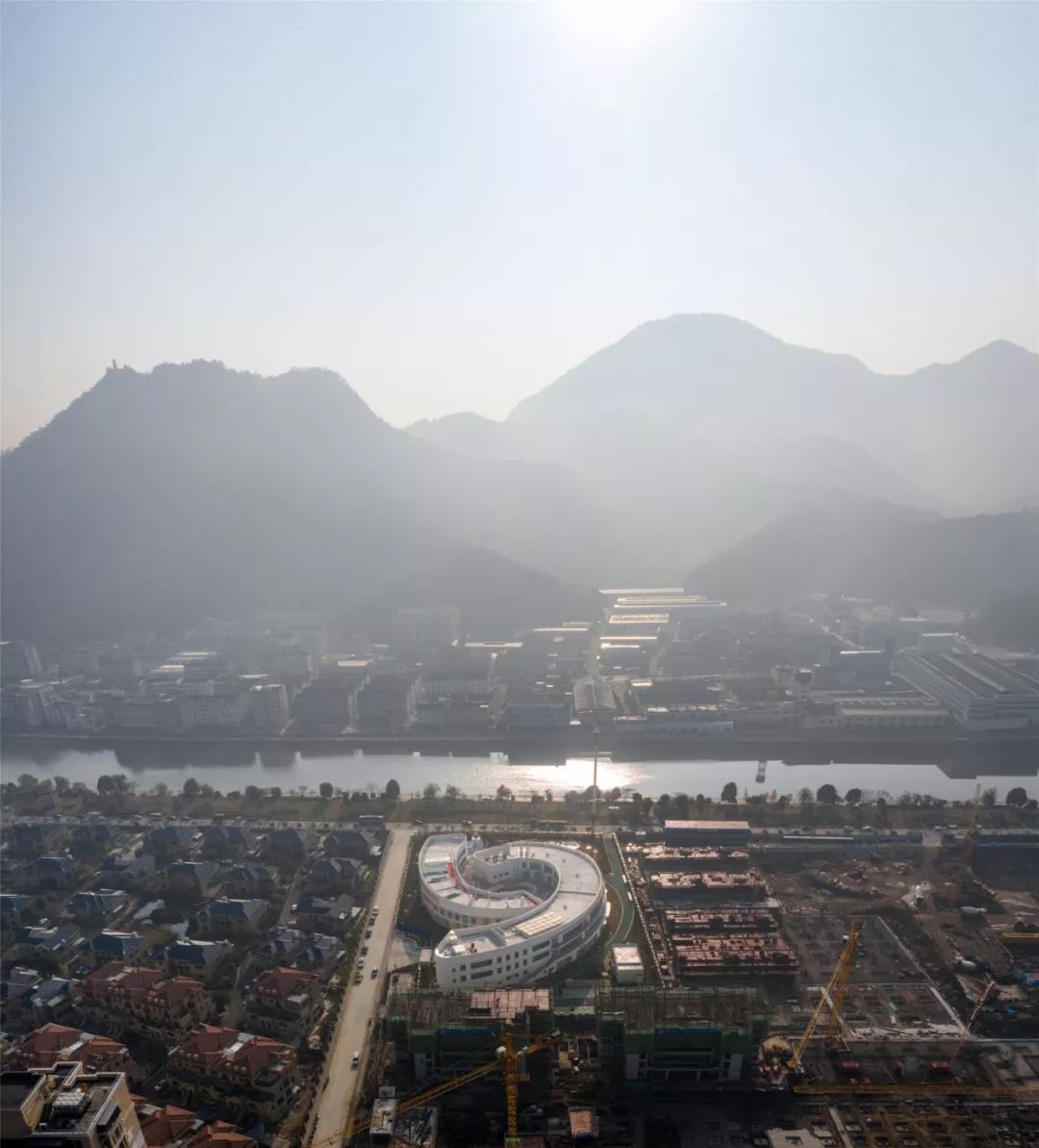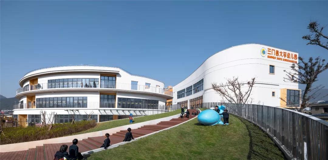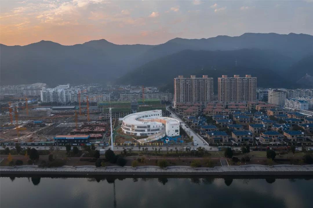 項目位于濱海縣城三門,地處臺州以東,群山環(huán)繞,臨海而居。由上海交大教育集團運管,臺州社發(fā)集團投資,思序設計團隊全程設計。和許多三線城市的校園建筑一樣,配套從屬其他功能建筑,并且落后于城市發(fā)展。通過設計改變這種現狀是設計師思考的第一個問題。從空中俯瞰三門,城市沿水系布局,建筑群規(guī)整而有序的沿道路布置,規(guī)整的建筑肌理反映了城市的高速發(fā)展。在項目的設計之初,設計團隊認為幼兒園應當成為孩子們的第一個藝術殿堂。因此在設計上第一步就是打破傳統(tǒng)幼兒園的規(guī)則布局,融合區(qū)域文化,從規(guī)則的城市肌理中跳出來,成為區(qū)域的點睛之筆。