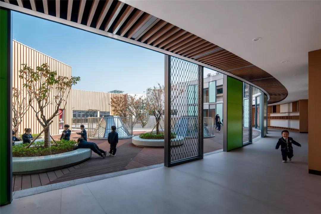 沿著入口的,是弧線形的安全路徑,孩子沿著明亮流暢的中庭肆意奔跑,便進入了擁抱聚合的“核心”——中央庭院中。這是一個橢圓形的中庭空間,抬頭便能望見天空,呼吸自然空氣。庭院由環(huán)繞走廊相連,為半室外的空間,室內外的界限在此消隱,而“藏”在分隔墻之后的,是孩子們的教室。它們被很好的包裹在了海螺的擁抱中,在自在的環(huán)境下學習成長。