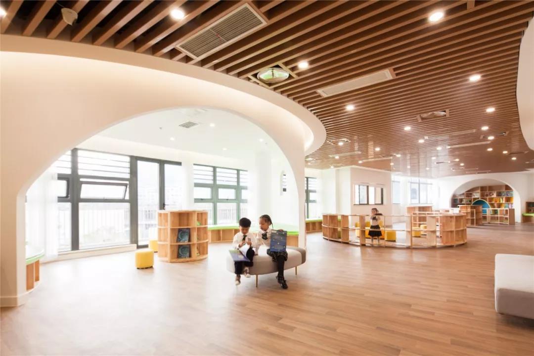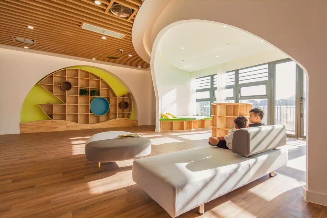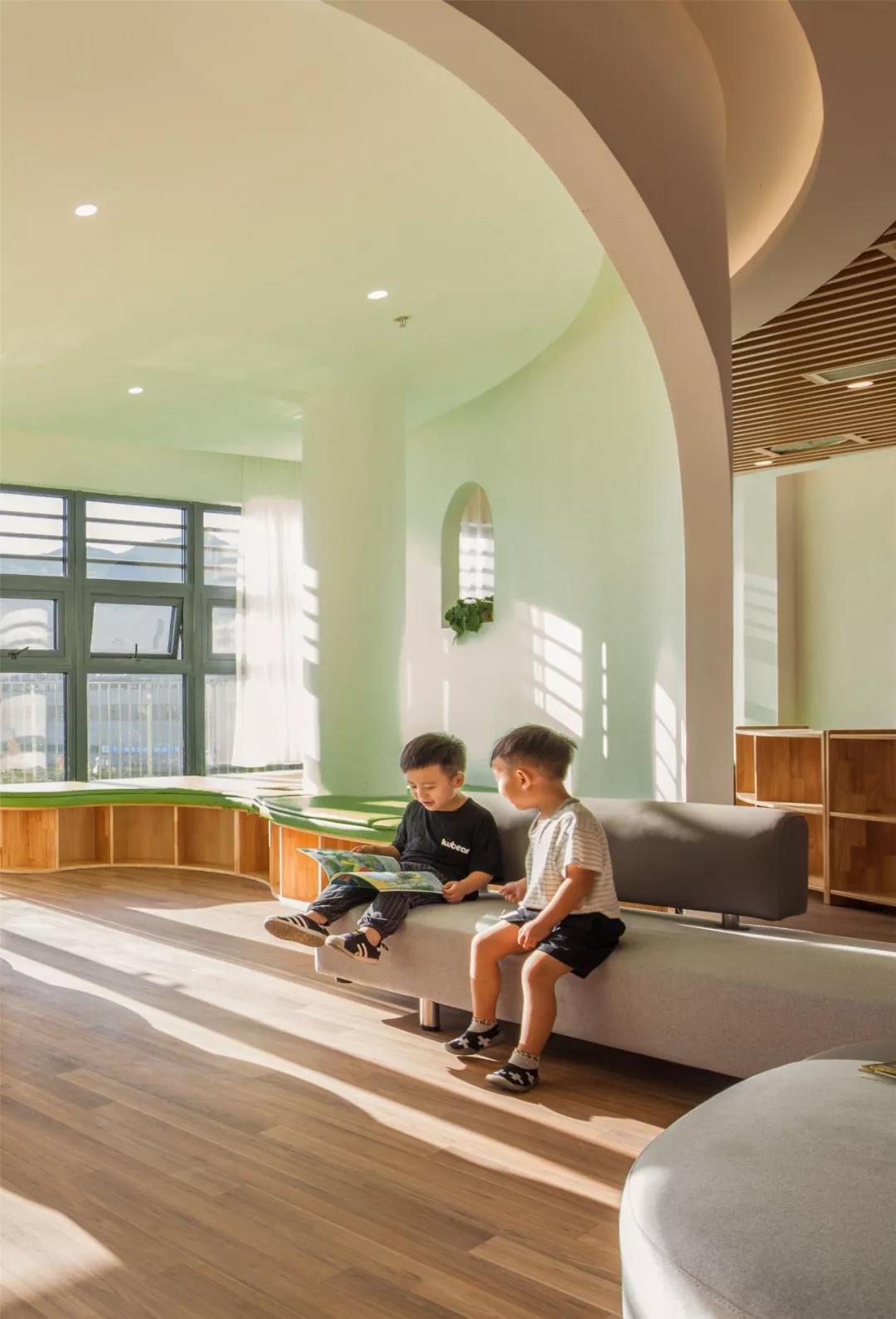 園內的智慧圖書室,用多樣的色彩和多元的弧形隔斷,形成了相對獨立又具有連通性,視覺通透的多元空間。沙發(fā)、長椅和小凳子隨意擺放,可坐可躺,讓孩子不自覺沉浸在閱讀的魅力中。