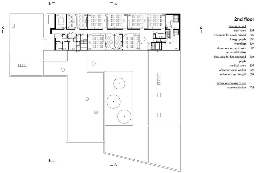 首層空間容納了育嬰室、體育館和幼兒園。小學設置在二層,學生們在進校之前需要先經由寬闊的樓梯行至上方樓層的庭院區域。