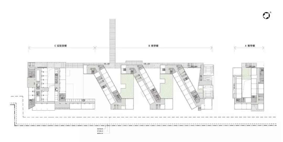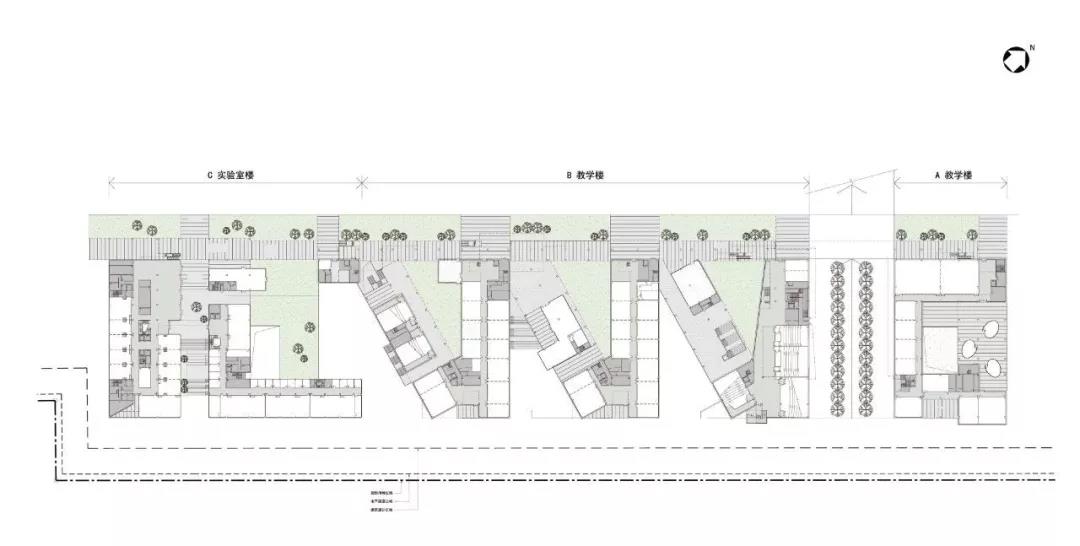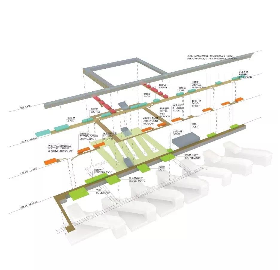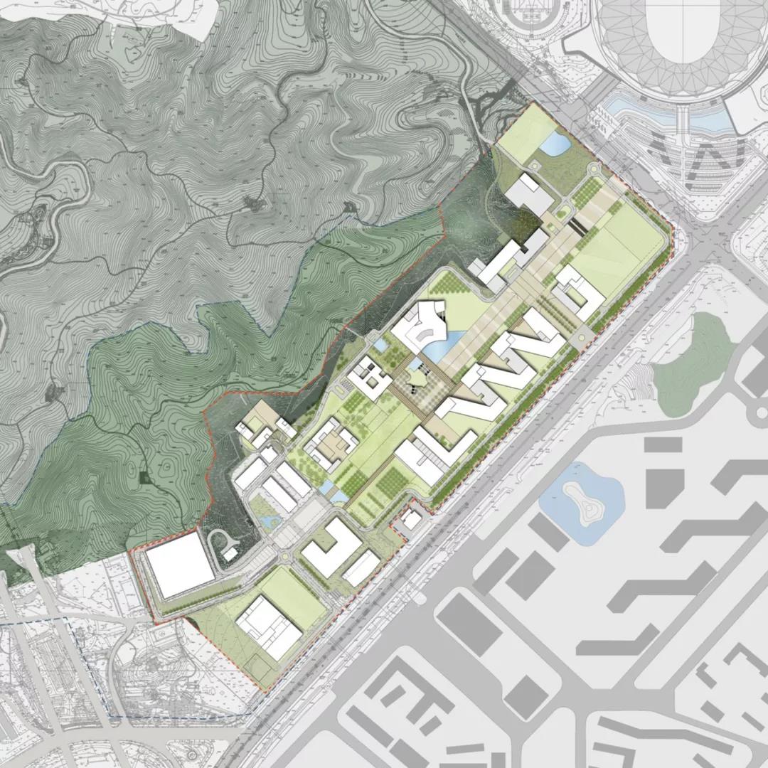 該項目以現(xiàn)有自然景觀作為主要規(guī)劃前提,為了充分利用其自然資源并最大限度地發(fā)揮場地功能,該校園分為三個區(qū)域:建筑與地形相融合的自然地形區(qū),位于城市邊緣的學(xué)術(shù)集群區(qū)以及在兩者之間綠色校園區(qū),它擁有一個休閑互動的中央開放空間。