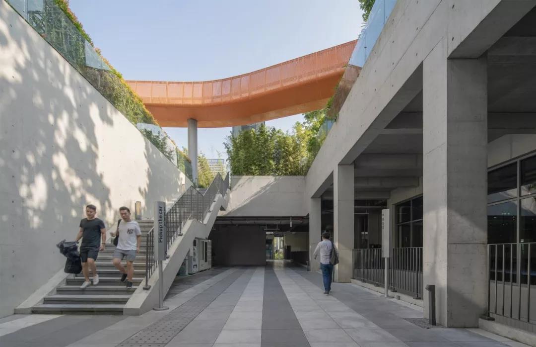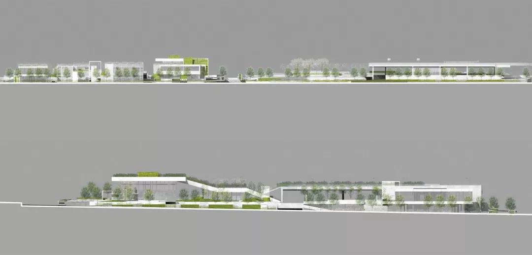 沿著空中漫步道來到位于基地遠端的屋頂球場。它是周邊居民和園區年輕人下班后的最佳鍛煉場地。社區健身的人群在這里可以遠眺整個北綠廊。運動場覆蓋在6000平米的公交站場上方,避免了露天的站場噪音廢氣對周邊的景觀傷害。在頂蓋的庇護下,乘客方便舒適地進出候車。在站場下方的空間也沒有閑置,與設計公社街道聯通,成為商業展覽設施。