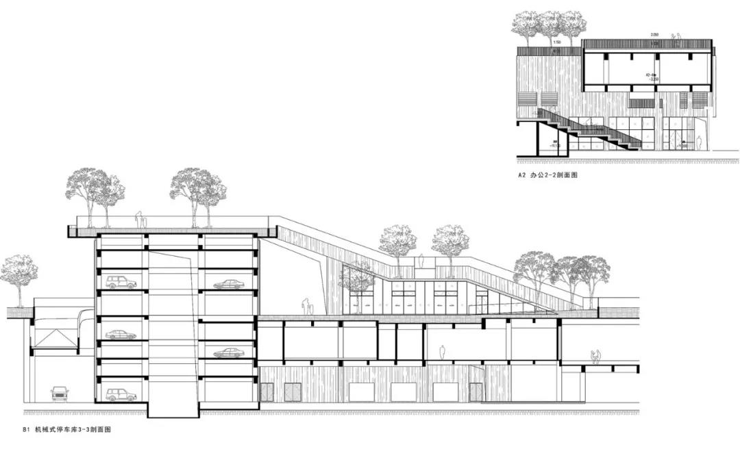 通過簡潔的玻璃幕墻,讓內部車廳的機械部件和車輛的往復運動從外部得以感知,形成自然的展示效果。車庫地面的下沉和隆起, 將公園變形成為立體綠化空間。陽光和空氣引入下沉庭院,坡道緩緩的向上延伸到10米高的觀景臺,并與貫穿綠廊的空中漫步道無縫連接,使車庫融入公園立體景觀。