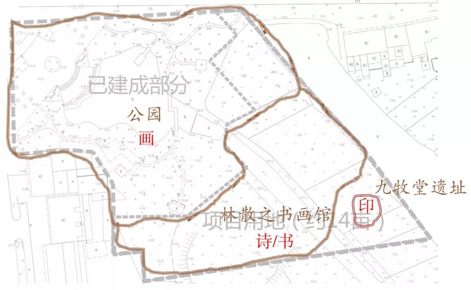 總體布局以中國(guó)傳統(tǒng)書畫為原型,提取詩(shī)、書、畫、印四個(gè)主要構(gòu)成元素,將公園與廣場(chǎng)視作“畫”,以林散之書畫院作為“詩(shī)”,選取了其名字中的“之”為載體,用“書法”的形式表現(xiàn)出來(lái),而方正的九牧堂又恰好可擬作“印”,同其他三個(gè)元素構(gòu)成完整的一幅古典長(zhǎng)卷。
