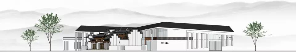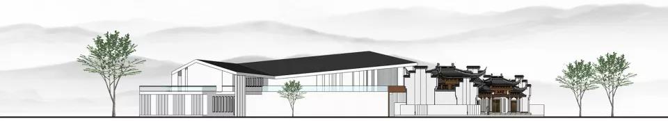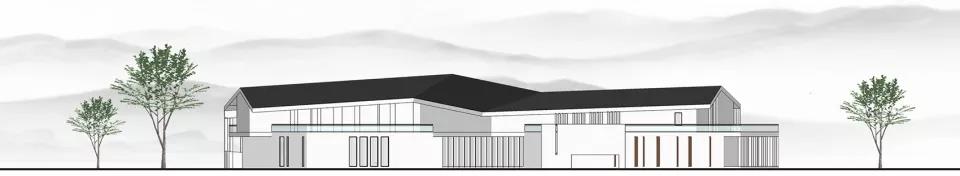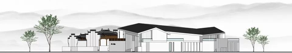 書畫院采用了白墻黑瓦的古樸材質(zhì),避免額外裝飾,僅用簡(jiǎn)練的幾何體量創(chuàng)造空間,與傳統(tǒng)徽派的九牧堂既對(duì)比又呼應(yīng)。建成之后的觀感也基本符合我們的預(yù)期,低緩的輪廓,交錯(cuò)的形體,多變的空間效果,加上景觀綠植的襯托,曲直錯(cuò)落,光影變幻,黑白起伏,遠(yuǎn)觀就像一幅山水畫卷。