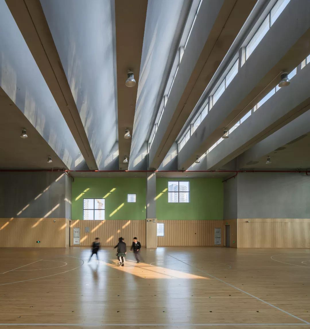 為了讓陽光照在每個孩子的書本上,在建筑密度較大的情況下,我們將專業(yè)教室等功能布置于一層,與虛體的院落和放大的公共區(qū)域共同塑造空間的趣味感。而普通教室按年級分棟,坐落其上,營造空間歸屬感,整個校園由二層平臺連為一體。平臺之下,曲徑通幽。平臺之上,肆意奔跑。