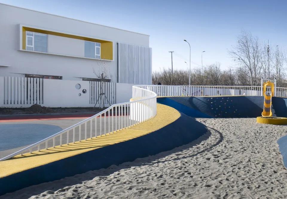 雖然整個(gè)幼兒園室外只使用了三種顏色 — 藍(lán)、黃、橙,但強(qiáng)烈的色彩對(duì)比和形狀沖突,讓幼兒園布局顯得設(shè)計(jì)概念感十足。此幼兒園室外的設(shè)計(jì)更是一場(chǎng)生活態(tài)度與藝術(shù)的邂逅,用無(wú)限想象力創(chuàng)造了一個(gè)無(wú)盡的空間。透過(guò)光影藝術(shù)表現(xiàn)對(duì)于美的無(wú)限幻想和無(wú)盡的創(chuàng)造之美。