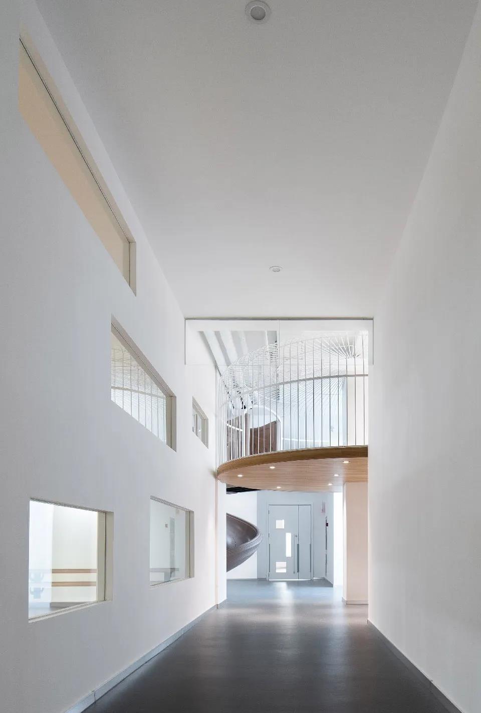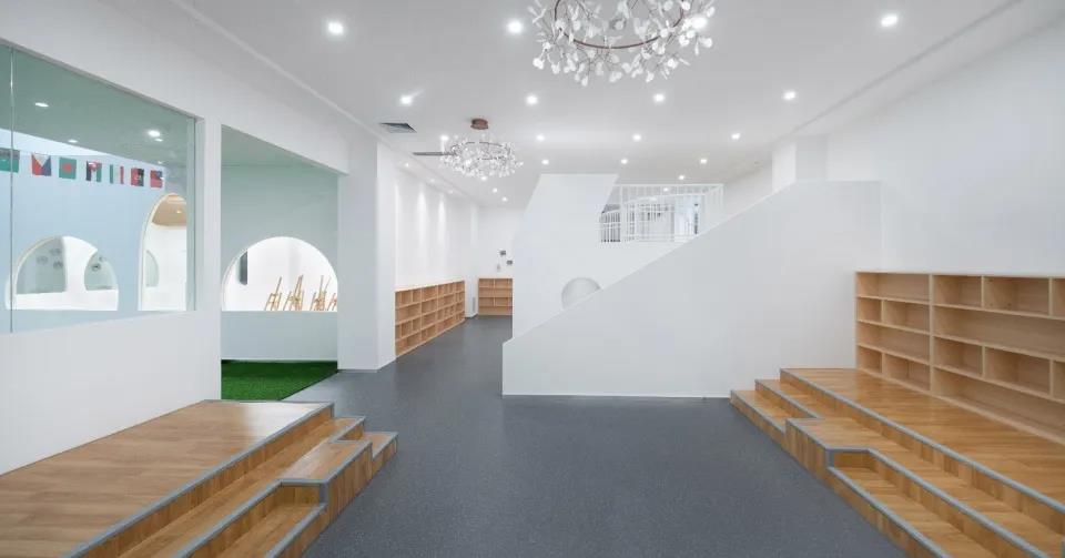 摒棄以往幼兒園中常見(jiàn)的斑斕彩色,以白色為主基調(diào),少許綠植作點(diǎn)綴,隱隱透著春天的氣息里,干凈而純粹的空間給予視野無(wú)限的放空與遐想。