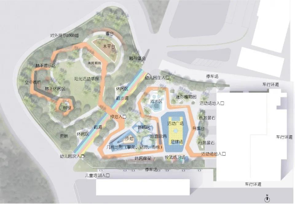 ▼兒童戶(hù)外游樂(lè)區(qū),強(qiáng)烈的形狀沖突讓幼兒園布局顯得設(shè)計(jì)概念感十足