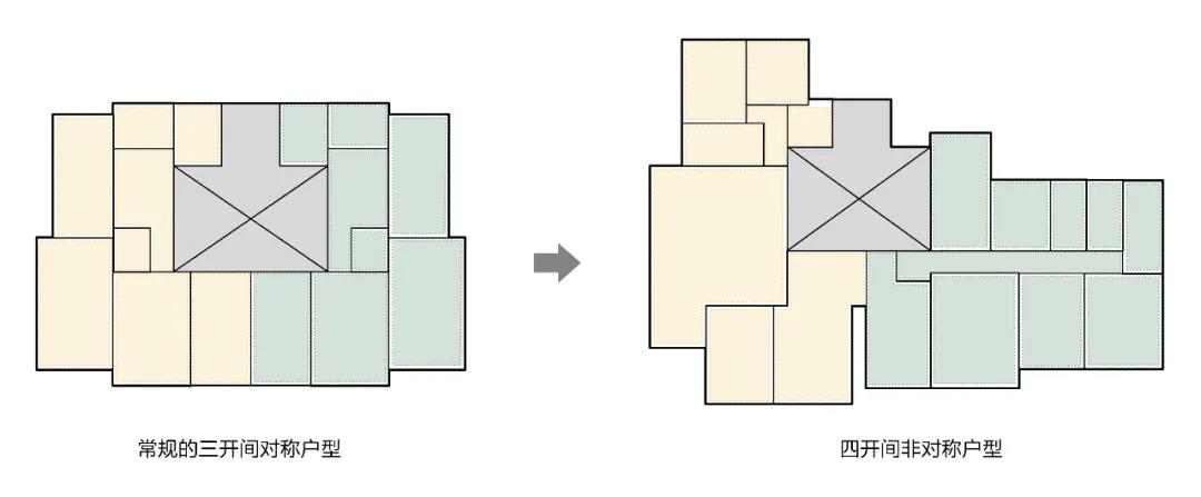 針對中心花園的優質景觀資源和東側城市道路的負面影響,標準層平面戶型設計不以常見的一梯兩戶、兩個三開間對稱戶型,而是采用L型戶型——4開間+2.5開間的組合方式。
