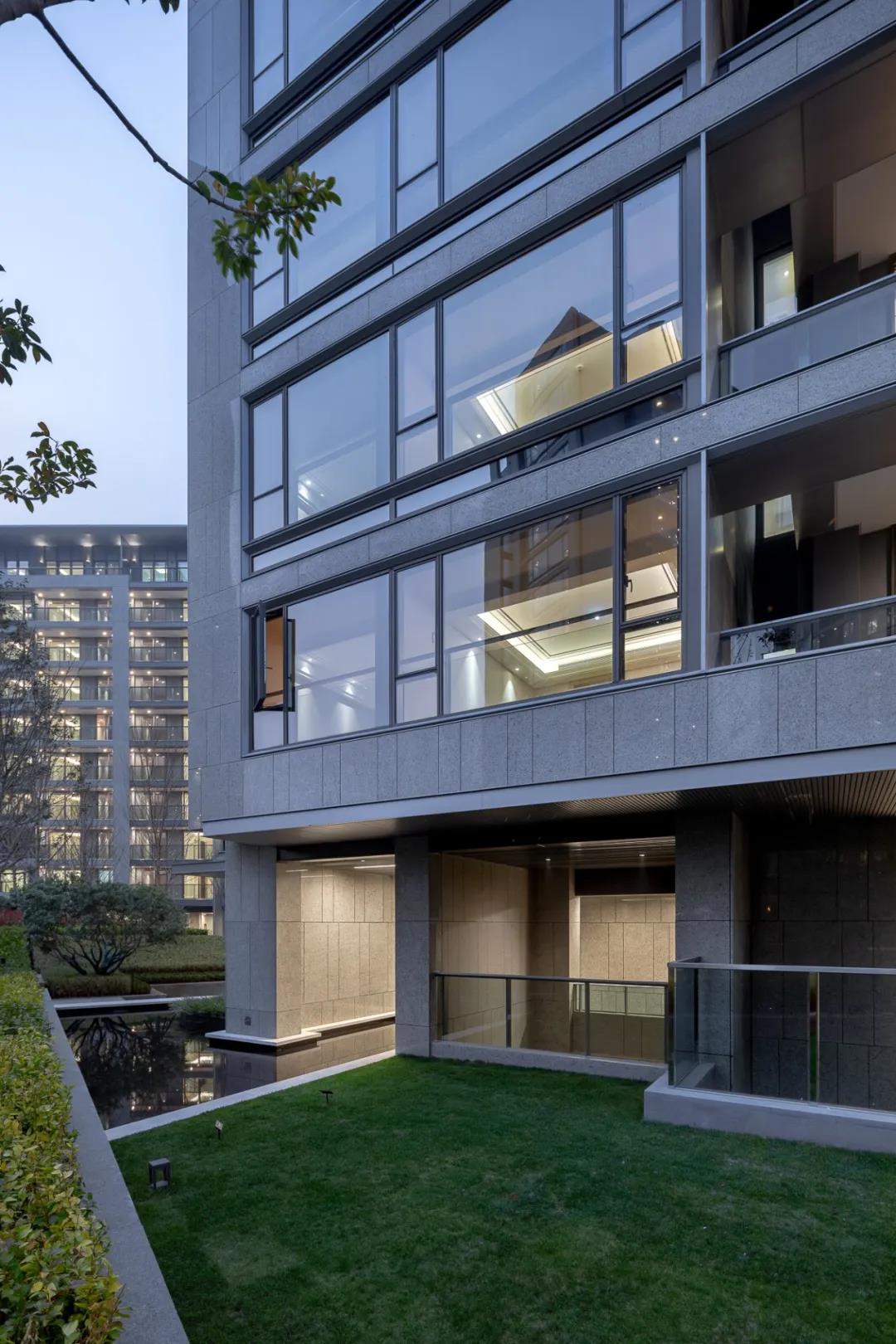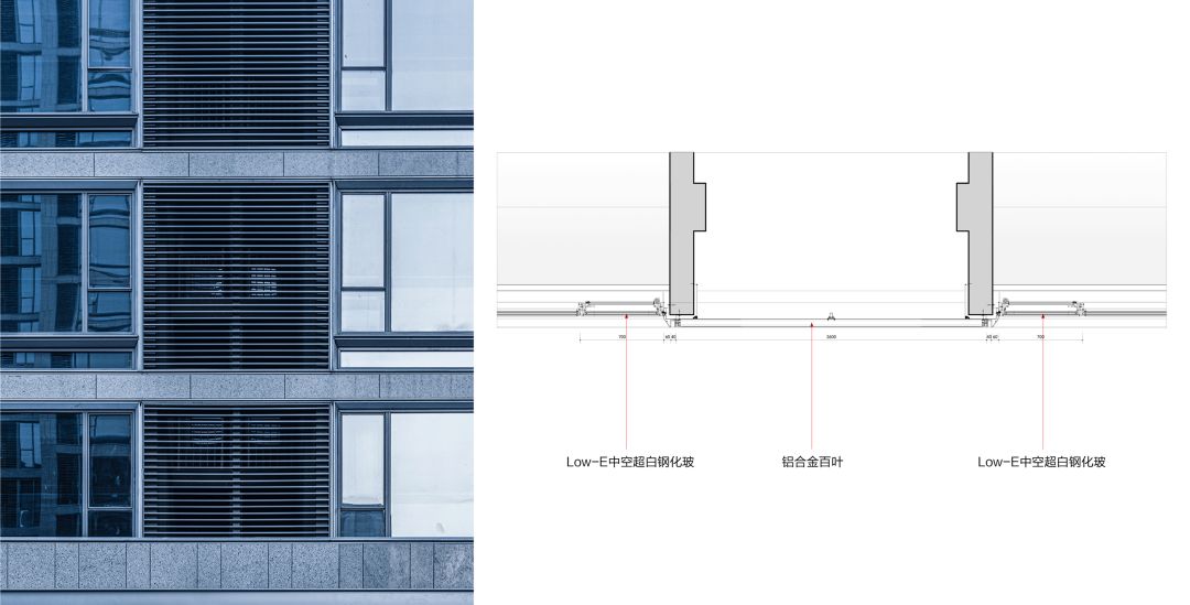 暖灰色的石材,以兩個不同的模數,進行錯縫劃分,豎向拼接,強化垂直感。金屬型材顏色,也做了兩種色彩區分。立面實虛交界處型材框都選用亮銀色噴涂,玻璃劃分立挺保持與玻璃一致,選用深灰色噴涂,這樣形成兩個立面層次,強化了洞口邊界的精致度。