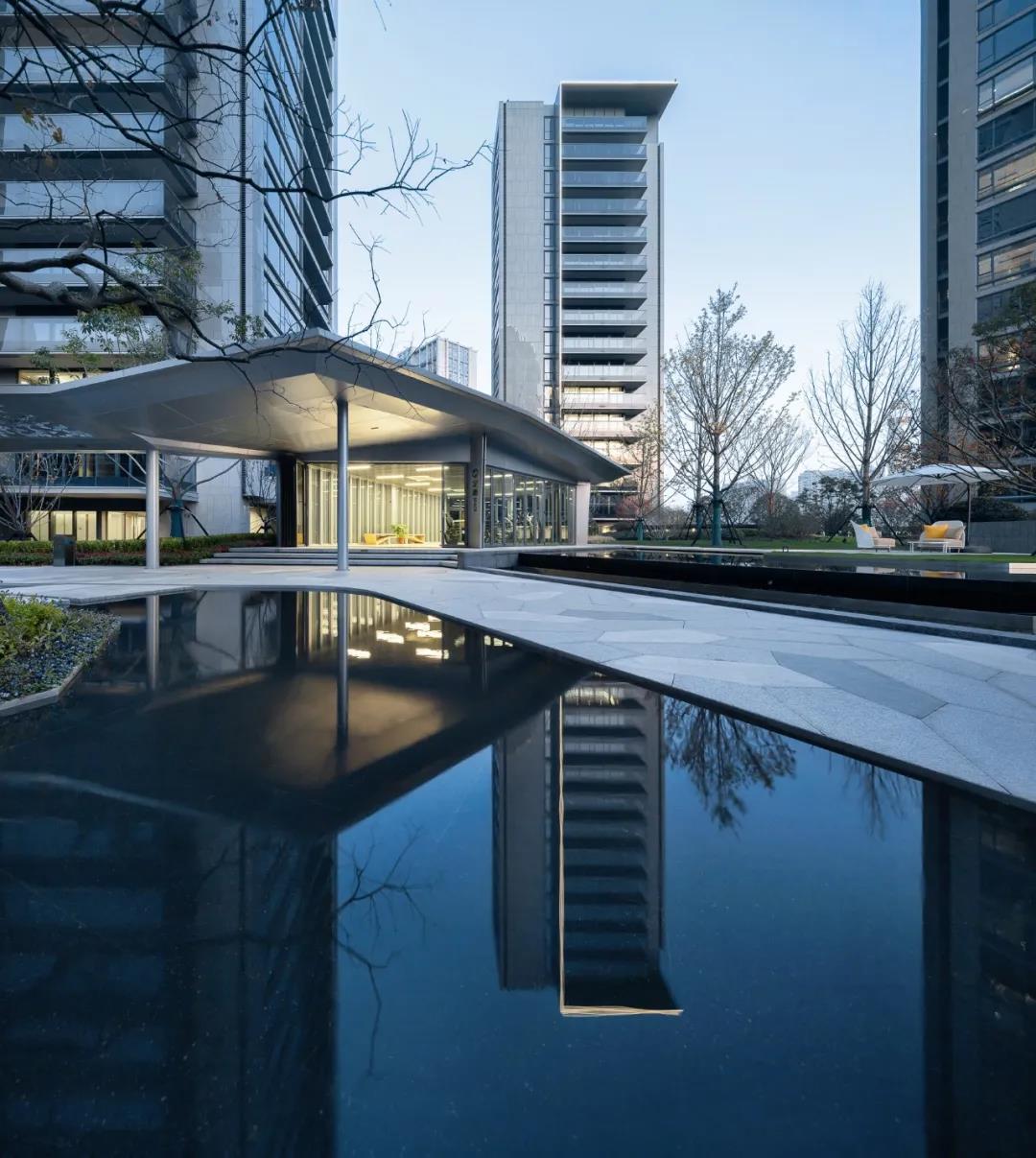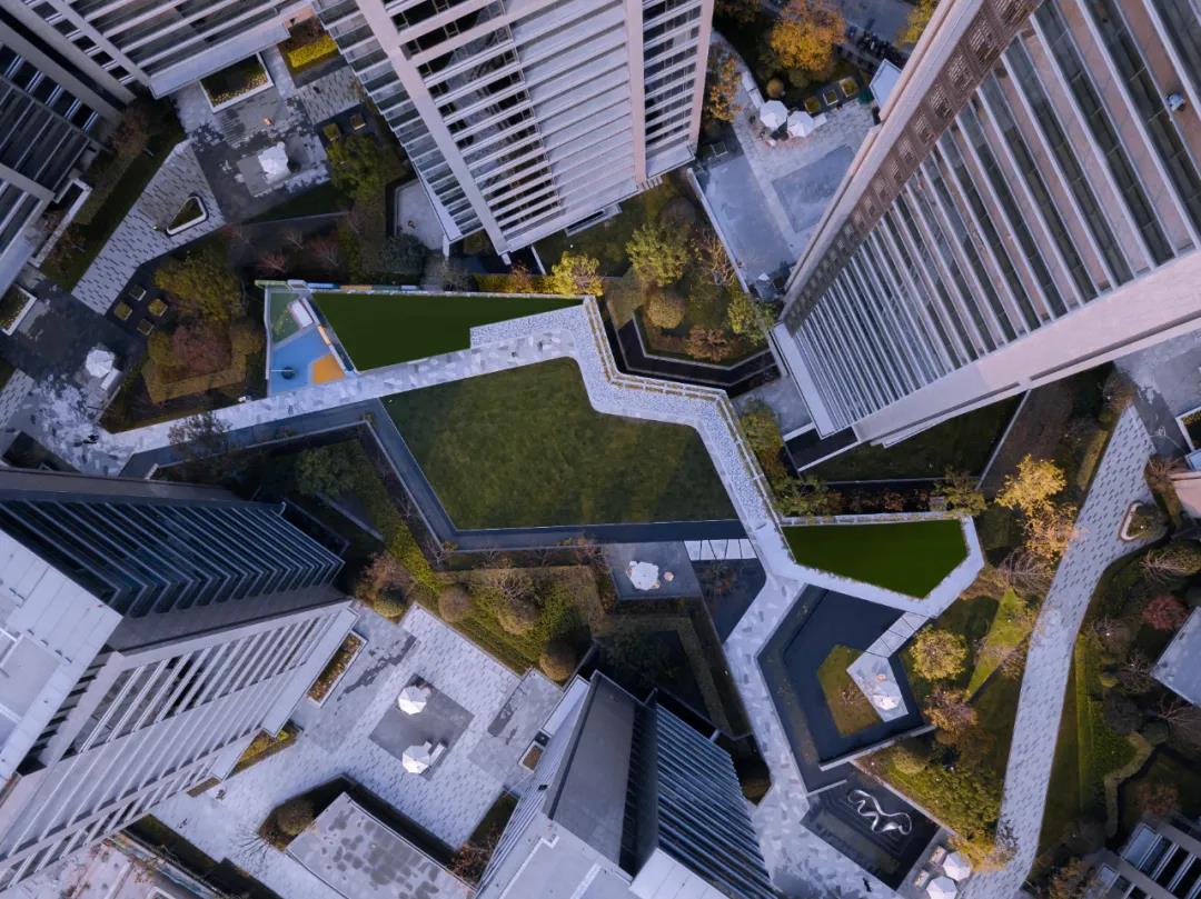 最后景觀設計單位以書法的筆觸為靈感完成了一個非常現代構成感的設計,通過一個連續的非線性折頂,勾勒出住戶的生活和社交軌跡,并串接了若干個尺度宜人的小花園。