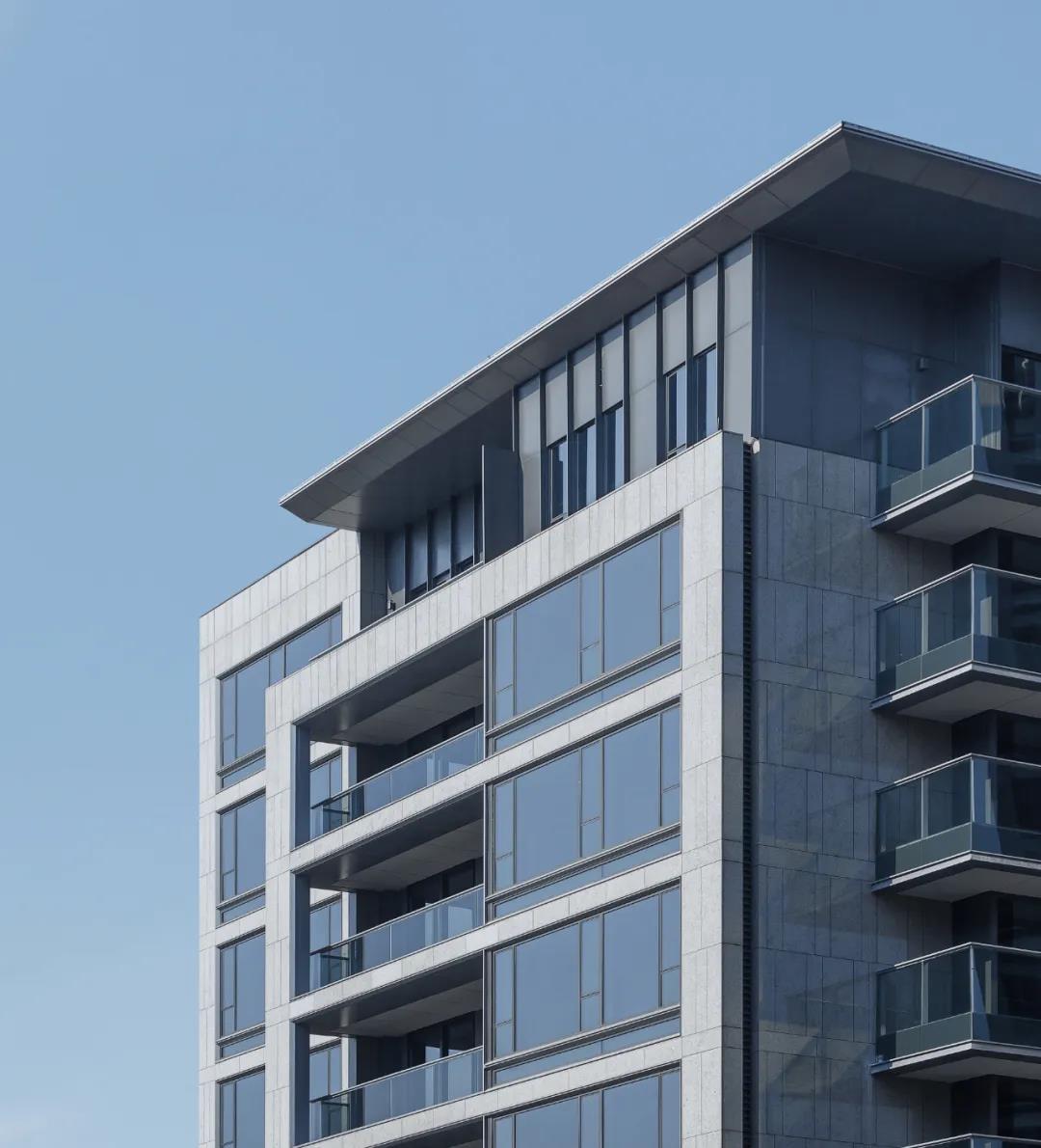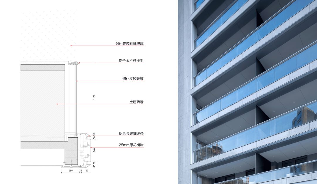 當地設計規范規定,住宅立面不允許使用幕墻系統。為此,我們與幕墻單位共同研發了一種類幕墻的窗體系,通俗地說,就是在土建結構上受力,外立面實現輕盈的連續玻璃幕墻效果,再根據不同的位置設計相應的構造節點。