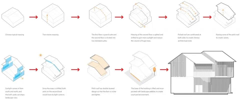 受古城啟發,酒店的總體規劃以南北為導向,兩座中層酒店大樓與六十座別墅沿中心軸線垂直布局。兩座酒店大樓置于總體規劃的北部,共提供二百間客房,并采用了單邊式走廊,飽覽優美河景。傳統建筑元素經重新演繹,遍布酒店內外,由外立面至客房內部皆貫徹統一。