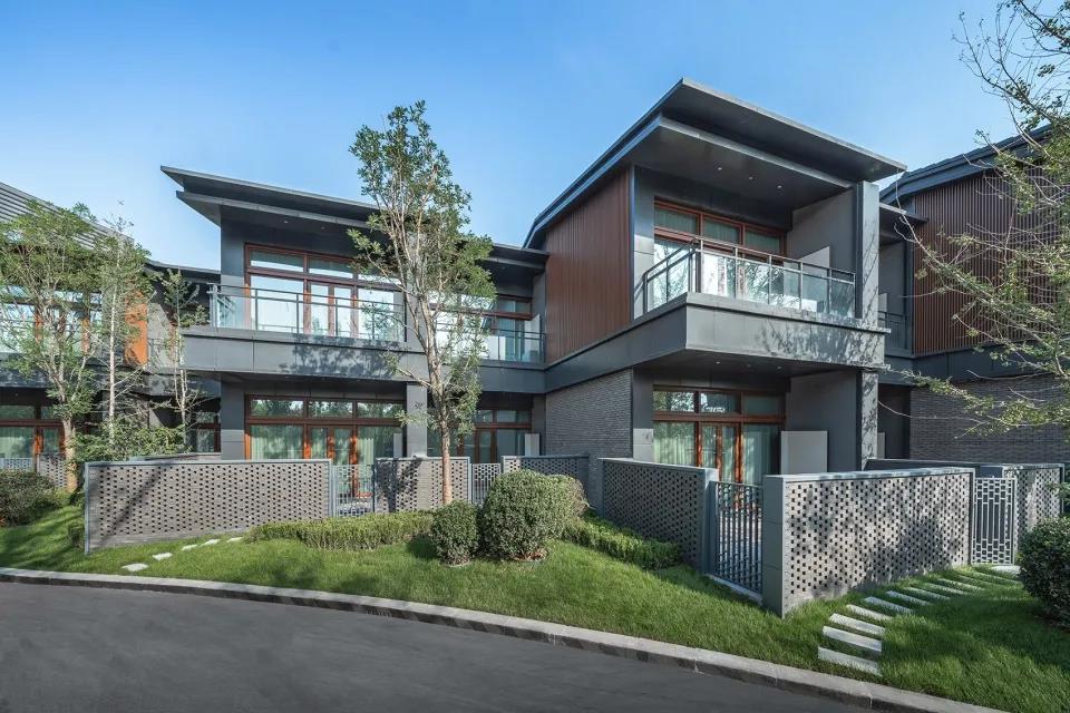 度假風的別墅體現了中國傳統庭院的現代詮釋。線條修長利落的雙層別墅群面向中央花園,并沿地塊周邊園林布置。別墅群平移錯落的排列,形成自成一角的私密空間,讓訪客盡情享受及放松。同時,別墅之間以流暢有序的庭院花園及有蓋行人道連接,將戶外自然環境與室內空間無縫連接,提供舒適開放的空間,讓訪客輕松游走恬靜的私人空間和共享小區。傾斜的屋頂及標志性的梁柱呼應傳統設計,突顯統一的整體建筑設計,更與當地小區建立密不可分的聯系。