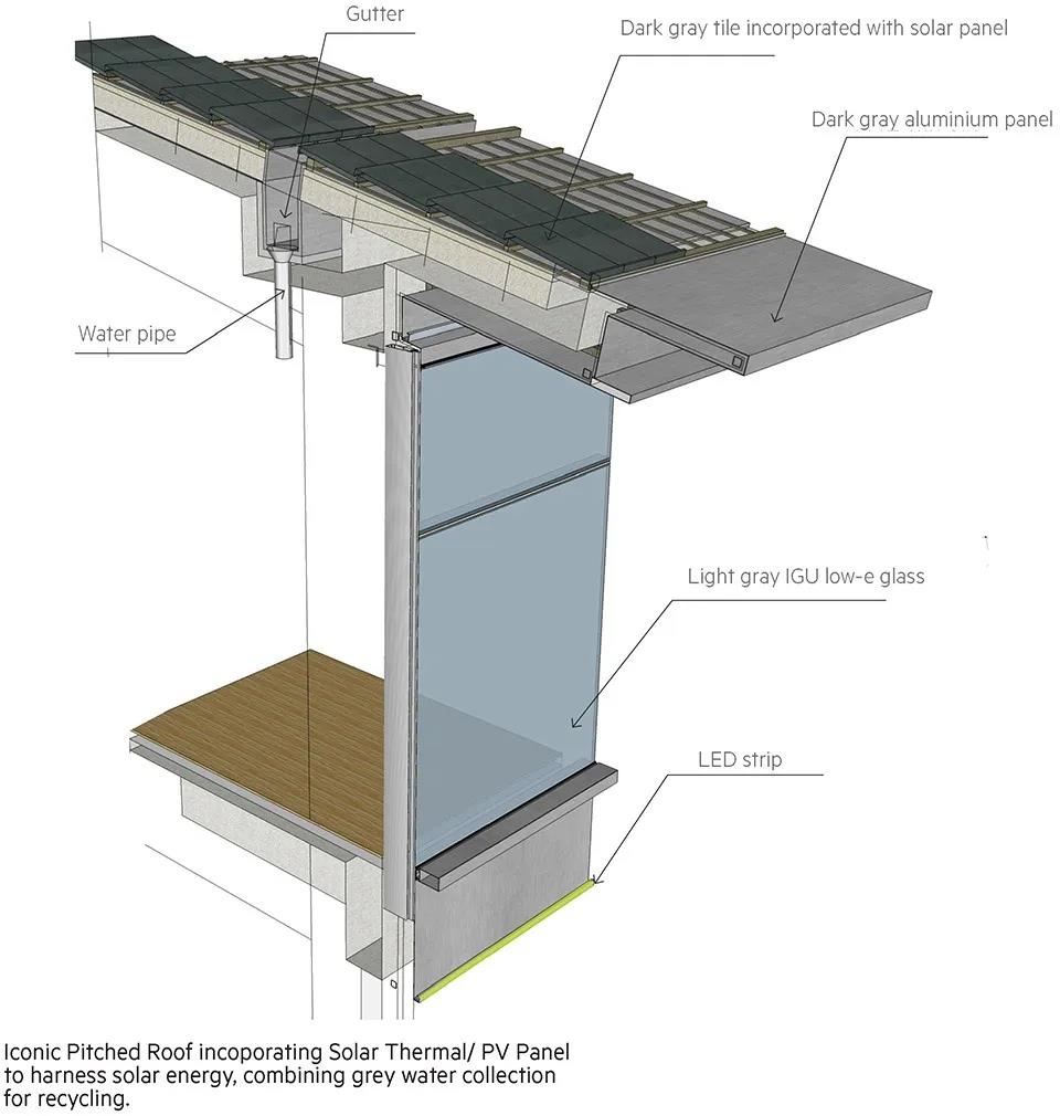 除了大型宴會廳﹑精品茶館﹑商務會議室和特色餐廳外,大自然的景觀也是河北賓館 · 安悅必不可缺的體驗。整個項目以青蔥翠綠的園林環境點綴,部分別墅屋頂種植了綠植,以降低室溫及減少耗能。項目內也設置了不少水景以緩和熱島效應。朝南的屋頂斜面上也安裝了太陽能板,進一步提升能源效益,而懸挑設計的屋頂使建筑物在夏季時更為涼快。